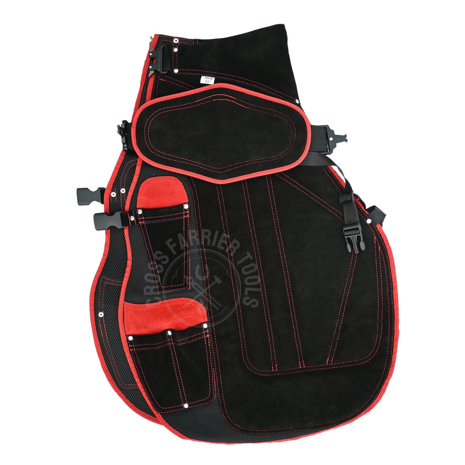 ผ้ากันเปื้อนช่างเกือกม้าแบบมืออาชีพ สีแดงดำ ทรงยาว พร้อมเข็มขัดปรับระดับได้แบบเปิดง่าย ระบายอากาศด้วยตาข่าย พร้อมช่องใส่มีด