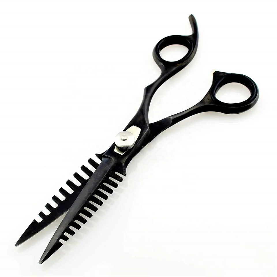 กรรไกรตัดผมพลาสม่าสีดำสำหรับช่างตัดผมมีดโกนฉลามแบบมืออาชีพทำด้วยมือปลายแหลม