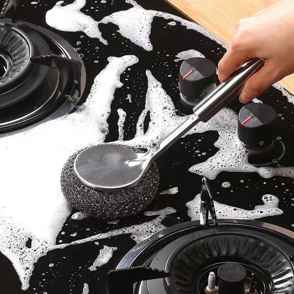 แปรงล้างจานด้ามยาวสแตนเลสอย่างดี สำหรับล้างหม้อ กระทะ เหล็กหล่อ ฟองน้ำล้างจาน ทำความสะอาดเร็ว