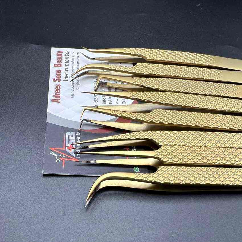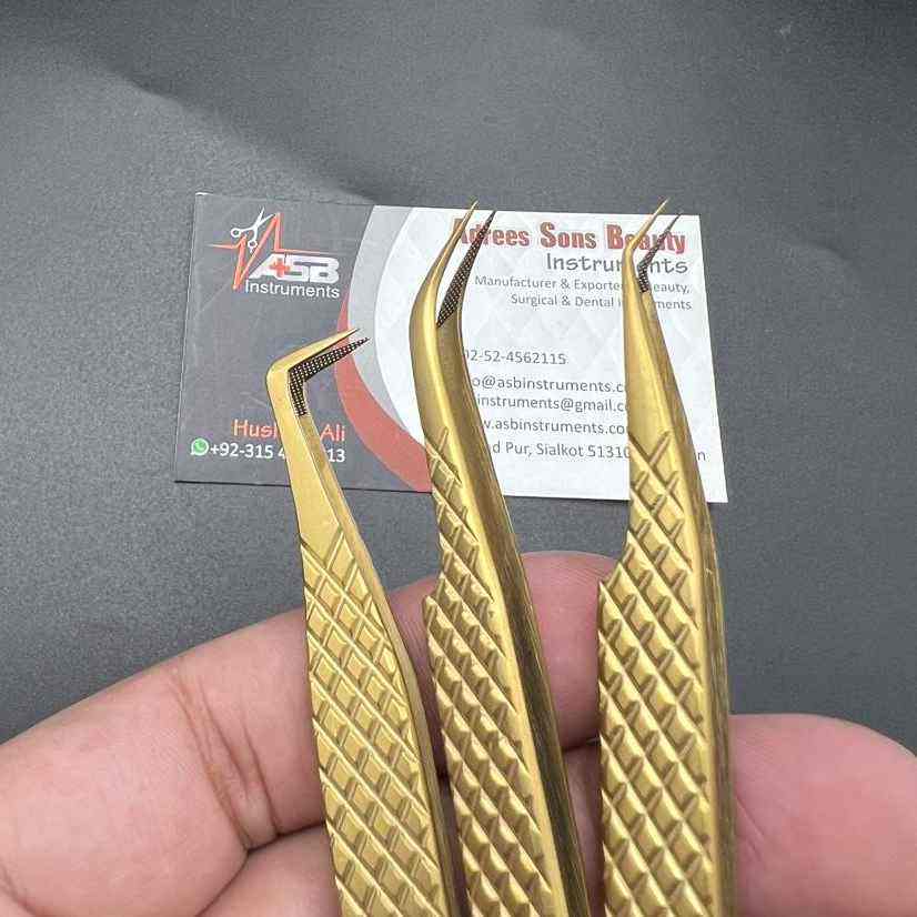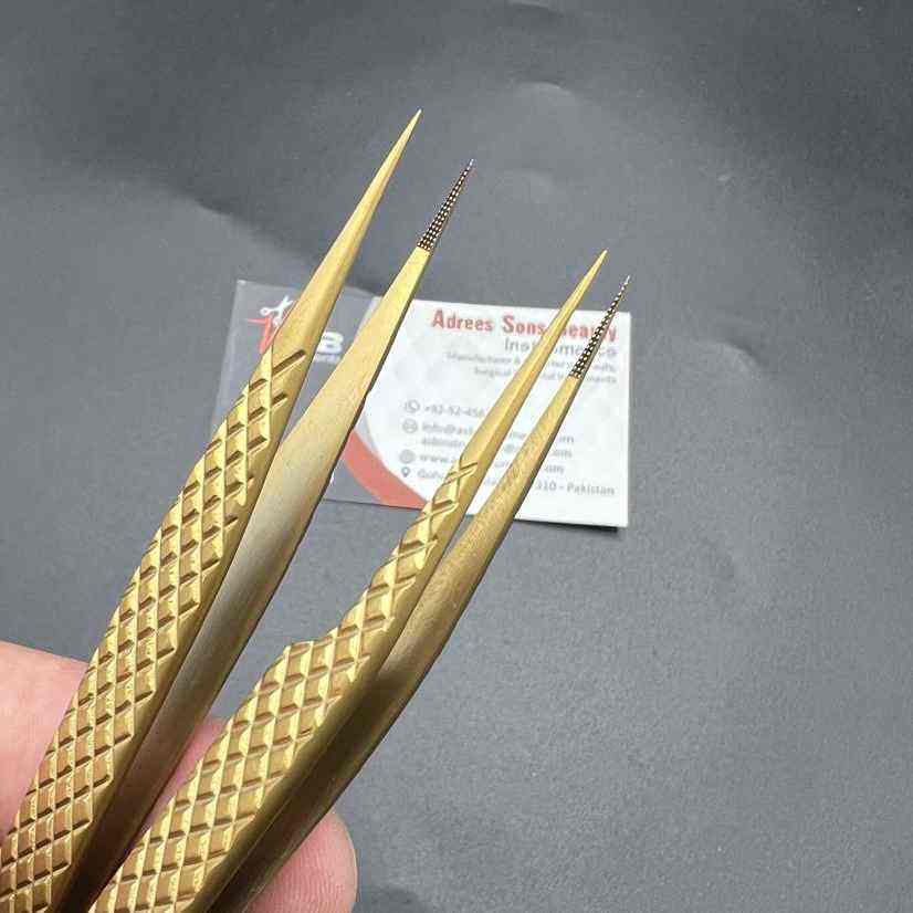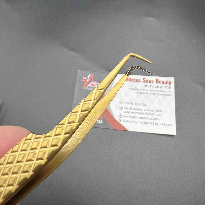 แหนบต่อขนตาปลายแหลมเคลือบนาโนไฟเบอร์สแตนเลสอย่างดี ป้องกันไฟฟ้าสถิต ผ่านการทดสอบด้วยมือ สีทองด้าน