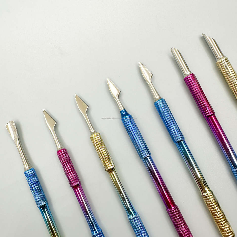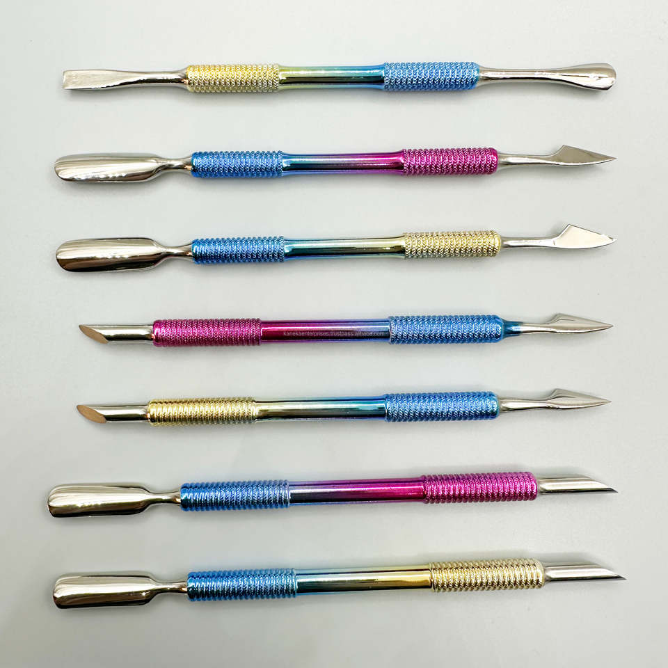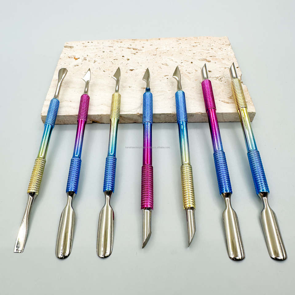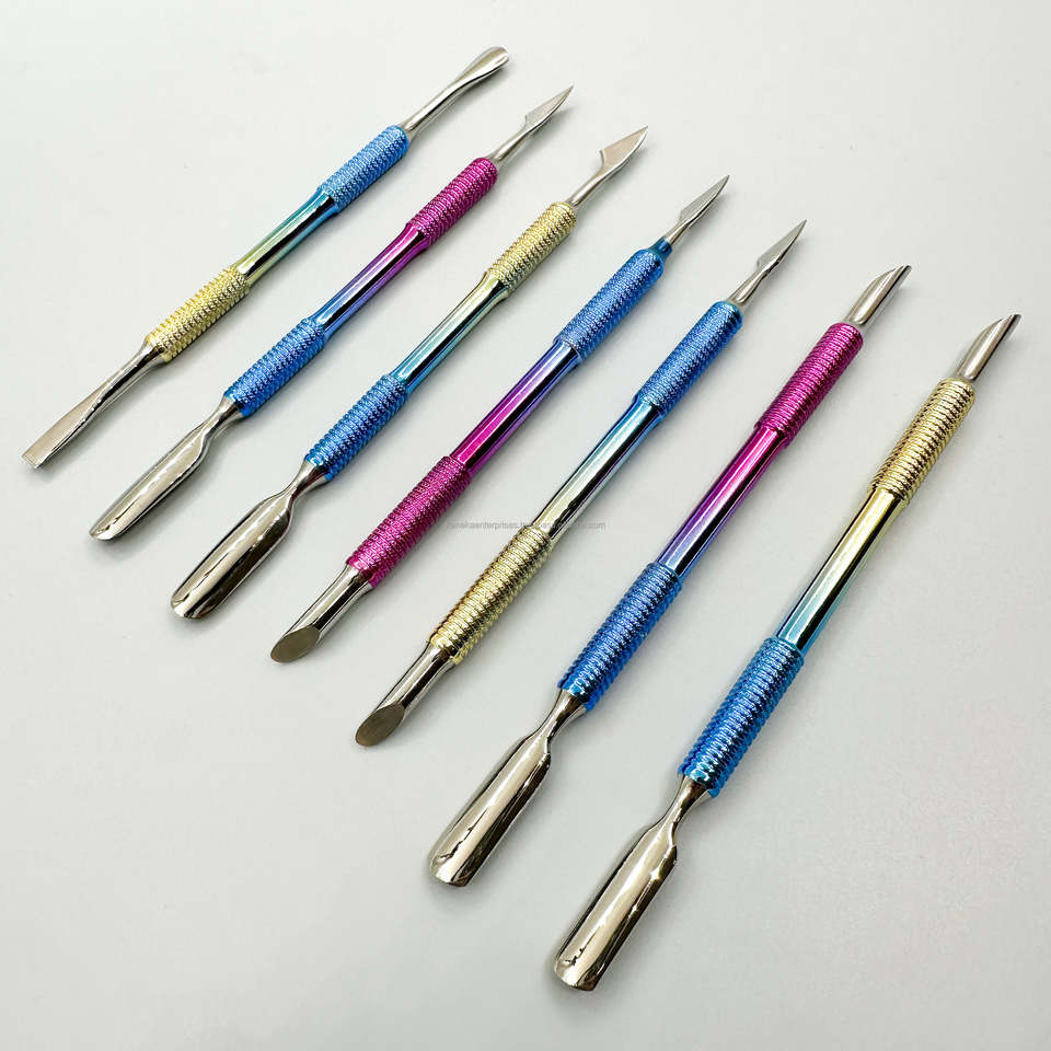 ที่ดันหนังกำพร้าแบบสองหัว ทำจากสแตนเลสอย่างดี ใช้ซ้ำได้ สองสี สำหรับทำความสะอาดเล็บ ทำเล็บมือและเล็บเท้า กำจัดหนังกำพร้า