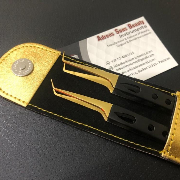 แหนบต่อขนตาแบบมุม90องศาทำจากสเตนเลสอย่างยั่งยืนอุปกรณ์เสริมความงามที่จับเป็นฟันปลาสีดำทองแบบมืออาชีพ