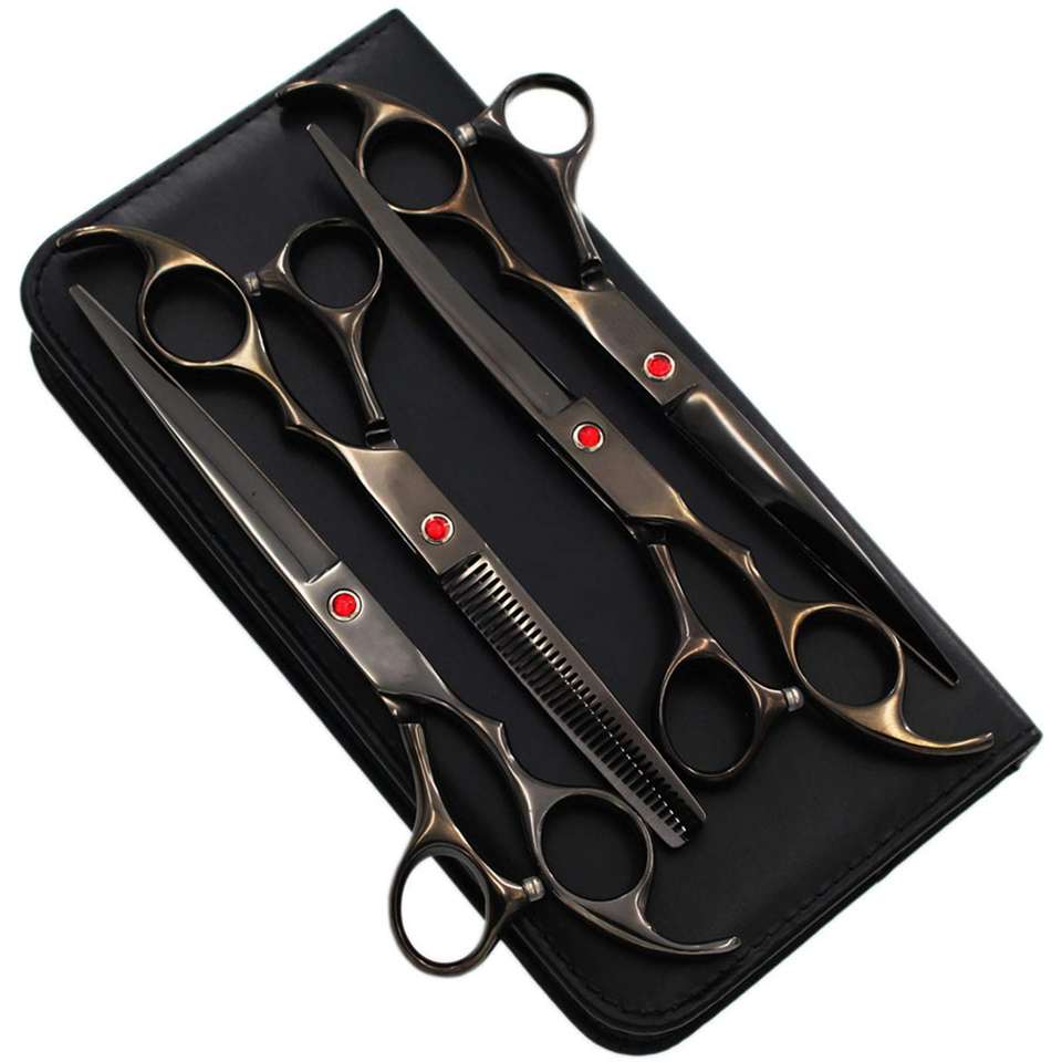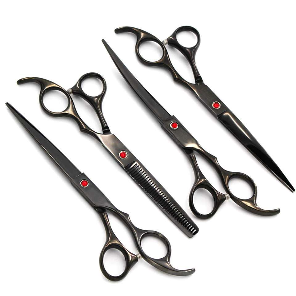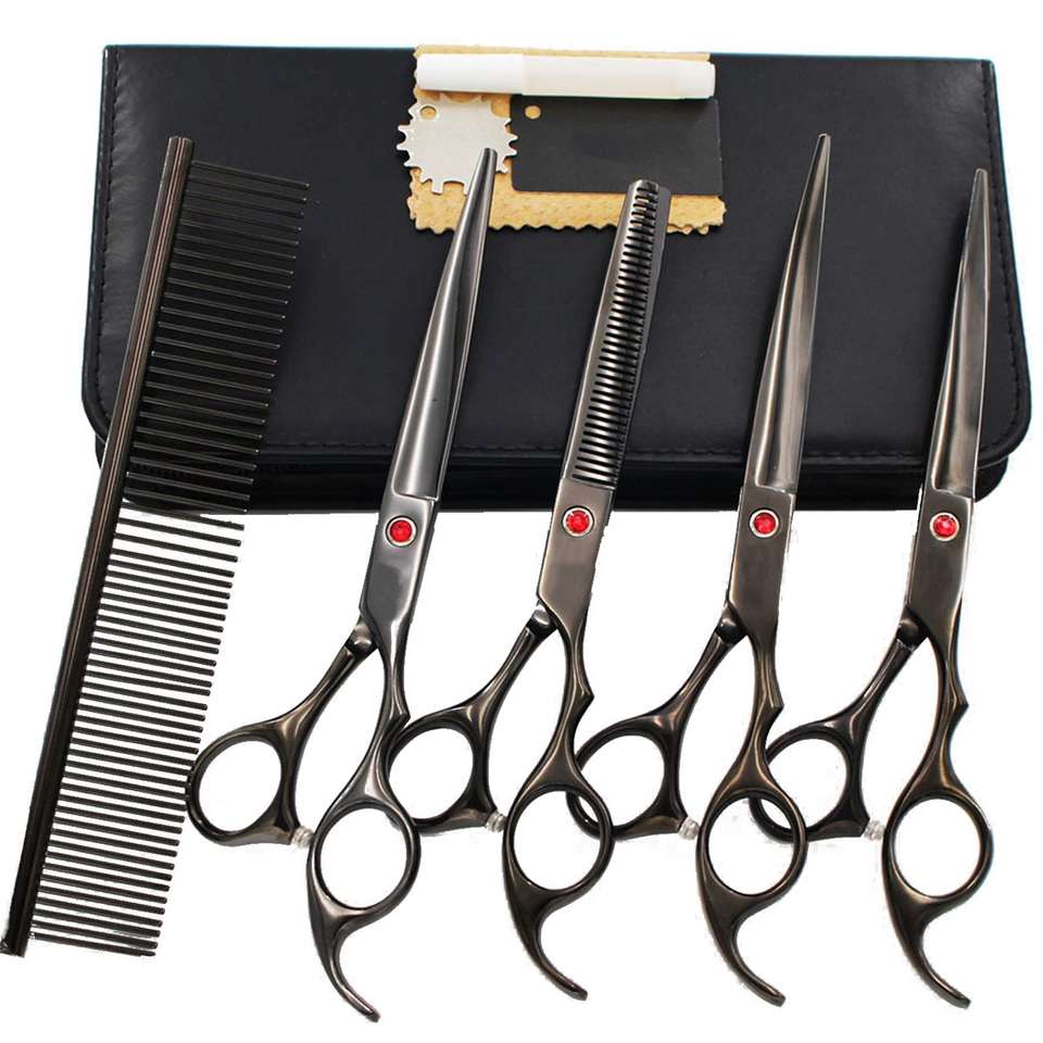 ชุดกรรไกรตัดแต่งขนสุนัขแบบมืออาชีพ ทำจากสแตนเลส ปลอดภัยต่อสิ่งแวดล้อม พร้อมใบมีดคมกริบ กรรไกรซอยโค้ง และหวีสำหรับสุนัข