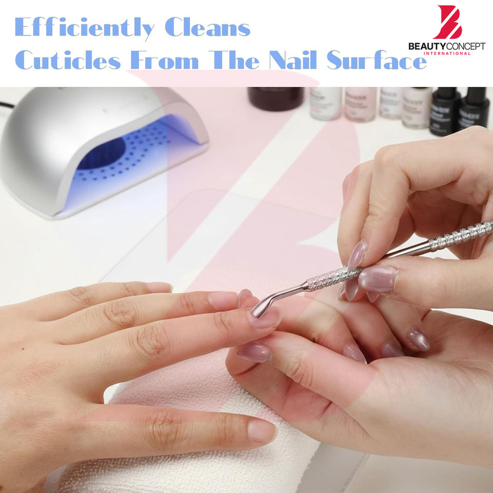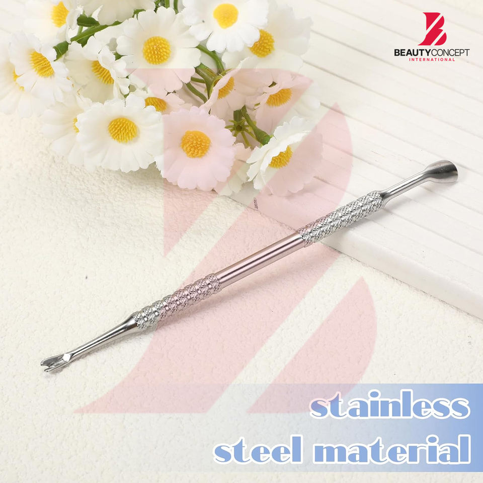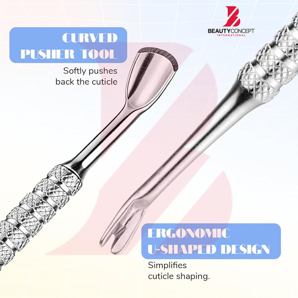 ที่ดันหนังกำพร้ารูปตัววี 2-in-1 ยี่ห้อ Beauty Concept International ผลิตจากสแตนเลสเกรดทางการแพทย์ ปลอดเชื้อได้ ใช้ตัดแต่งเล็บได้