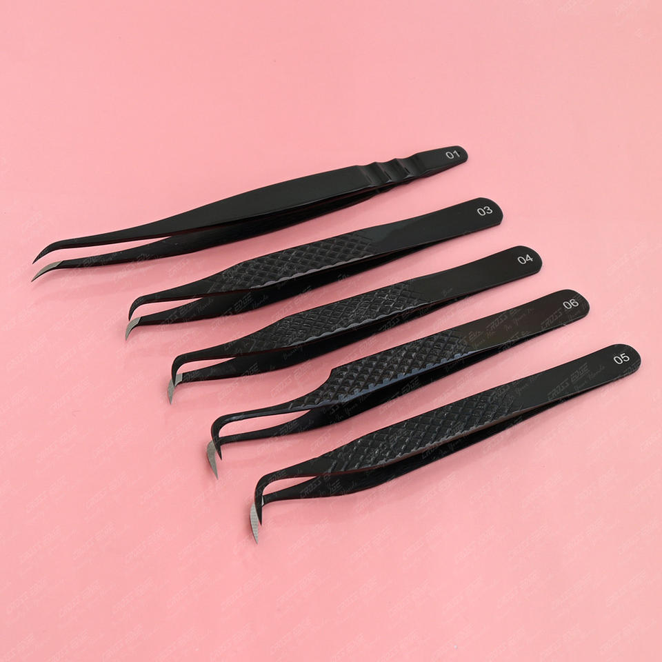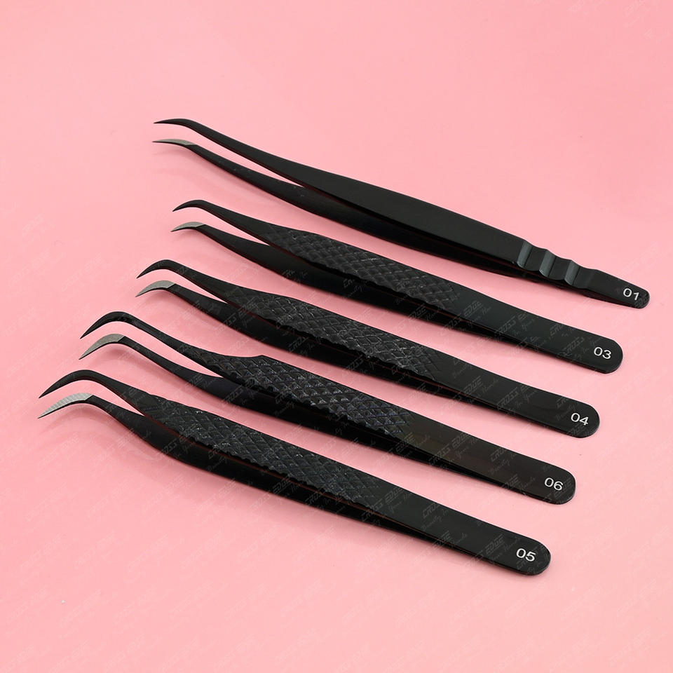 แหนบปลายขนตาปลอมสีดำแบบมืออาชีพแหนบตะขอเกี่ยวโค้งสแตนเลสสีดำ