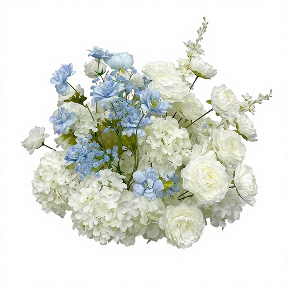 ดอกกุหลาบประดิษฐ์สีขาวน้ำเงินทำจากผ้าไหมและพลาสติกสำหรับตกแต่งโต๊ะงานแต่งงาน