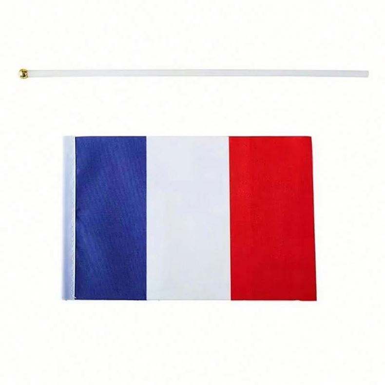 ธงโบกมือขนาดเล็กแบบพกพาสำหรับทุกประเทศ ฝรั่งเศส ผลิตจากโพลีเอสเตอร์ พิมพ์ลายสองด้านตามสั่ง พร้อมโลโก้ตามต้องการ เหมาะสำหรับงานอีเว้นท์
