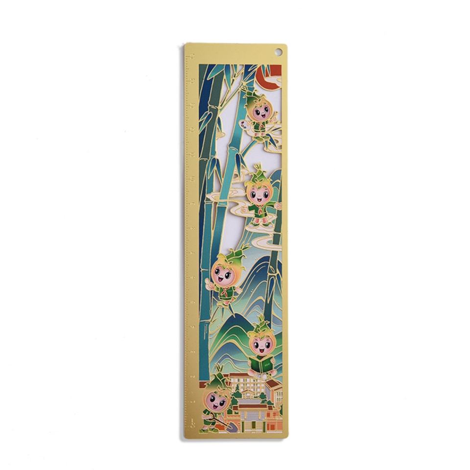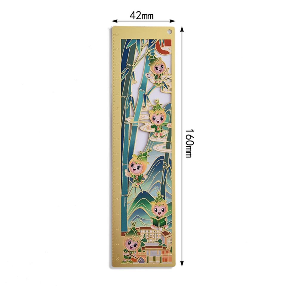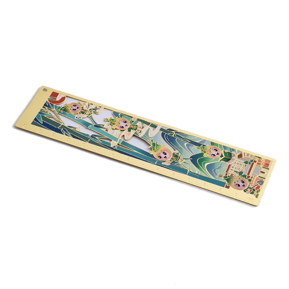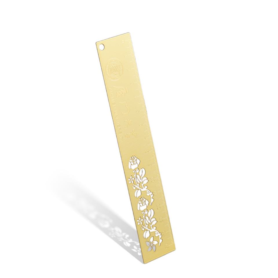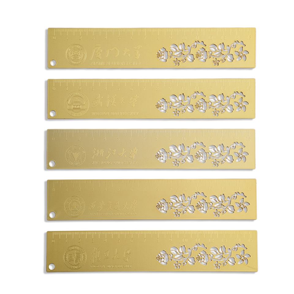 ไม้บรรทัดโลหะสีทองแบบโปรโมชั่น สลักลายสไตล์จีน พิมพ์โลโก้ด้วย UV ใช้เป็นที่คั่นหนังสือสำหรับโรงเรียน