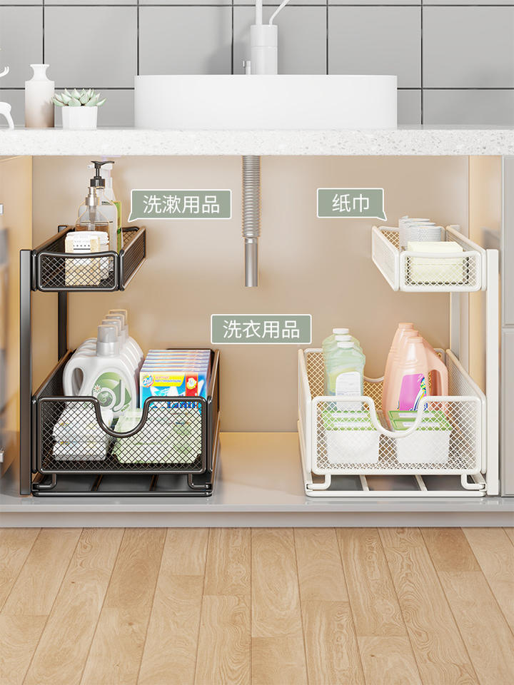 ชั้นวางของเหล็กแบบดึงออกได้สำหรับอ่างล้างจานในครัว ตู้อเนกประสงค์พร้อมตะกร้าแบบดึงออกได้และชั้นวางแบบซ้อน