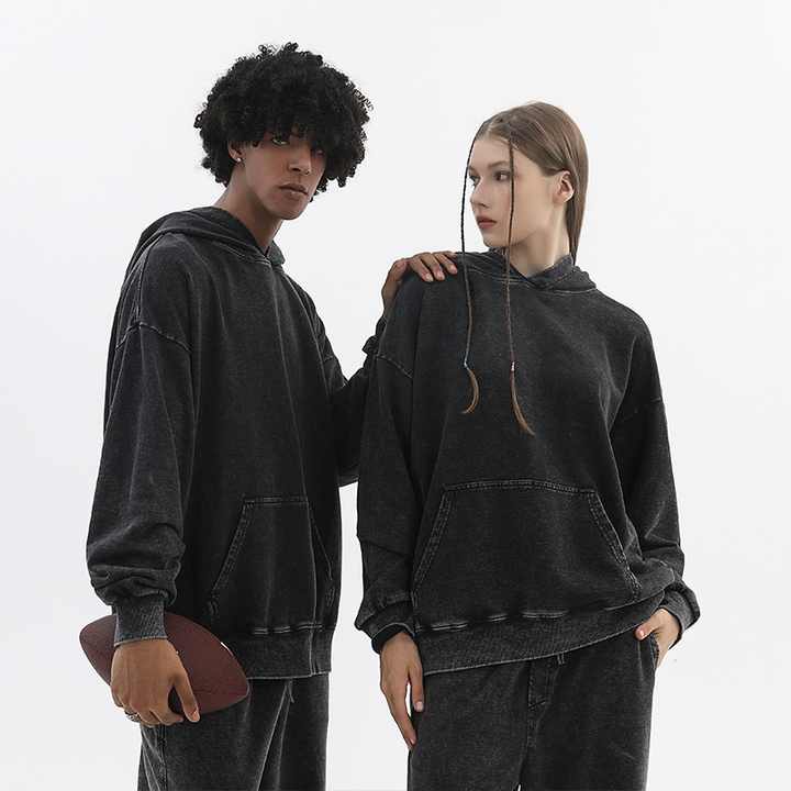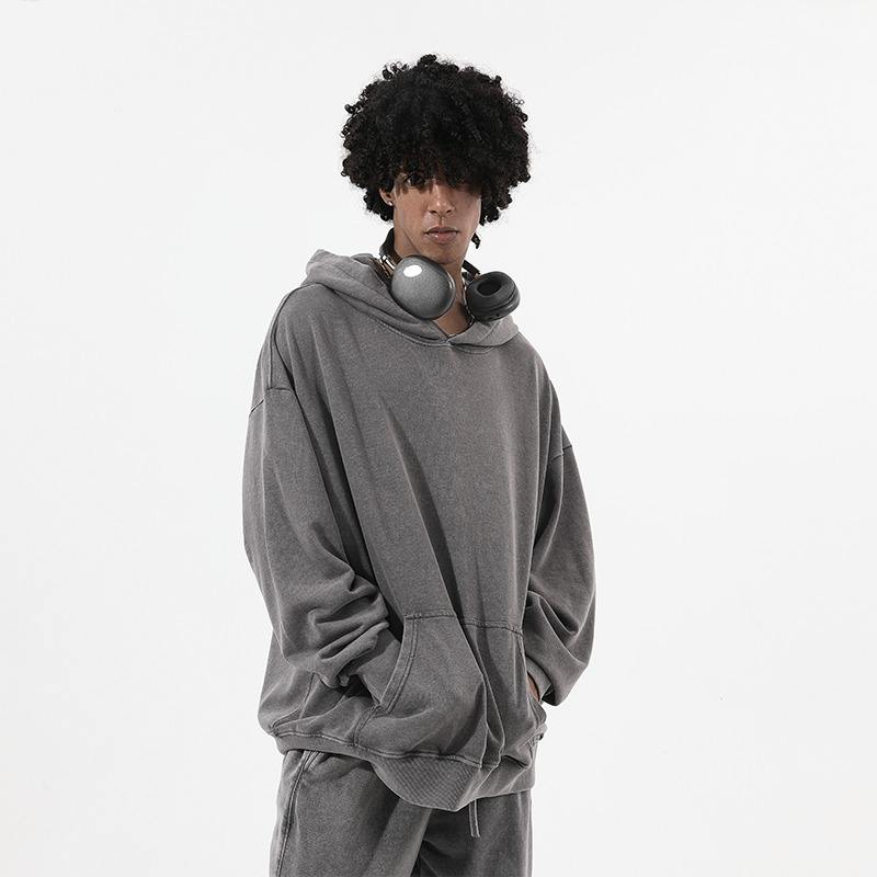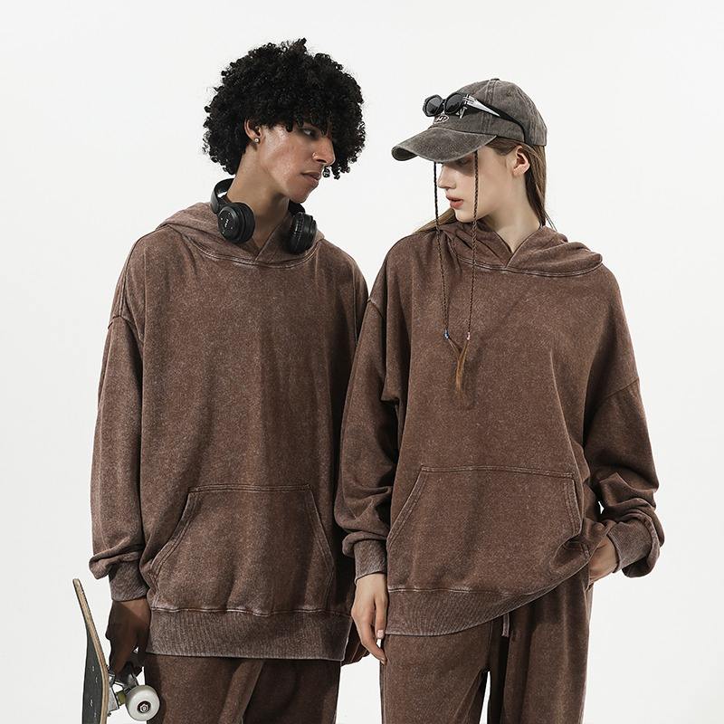 เสื้อสเวตเตอร์ซักหินแบบลำลองแบบสวมหัวเสื้อมีฮู้ดโอเวอร์ไซส์ผ้าเทอร์รี่พิมพ์ลายไซส์วินเทจ
