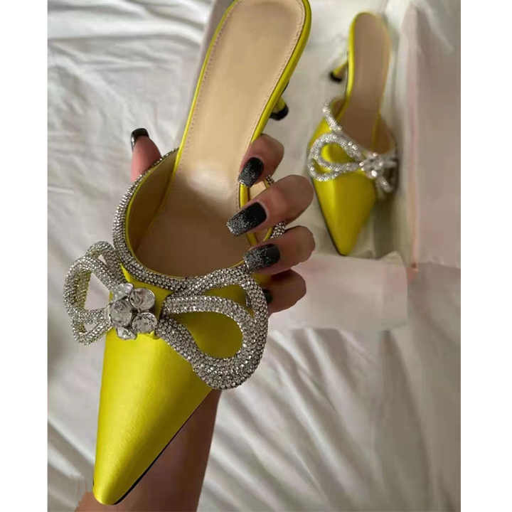 รองเท้าส้นสูงประดับเพชรพลอย แฟชั่นเซ็กซี่ โบว์ใหญ่ ส้นเตี้ยสำหรับผู้หญิง สีเขียวและสีเงิน ส้นสูงหรูหรา ทำจากวัสดุ PU 1 คู่