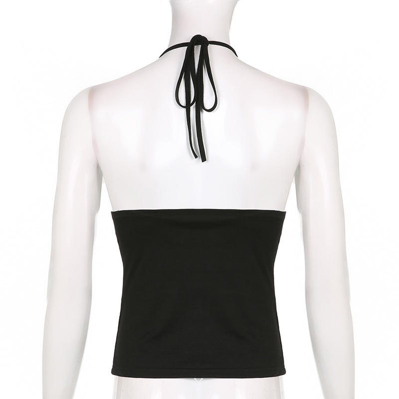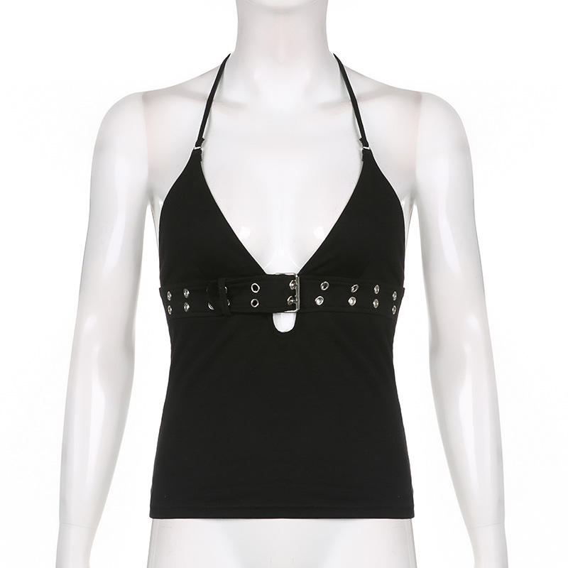 เสื้อครอปเปิดไหล่สไตล์พังก์สตรีทสำหรับฤดูร้อน พร้อมเข็มขัดรัดเอวสูงปรับได้ ผูกด้านหน้า ทรงเข้ารูป ไม่มีแขน