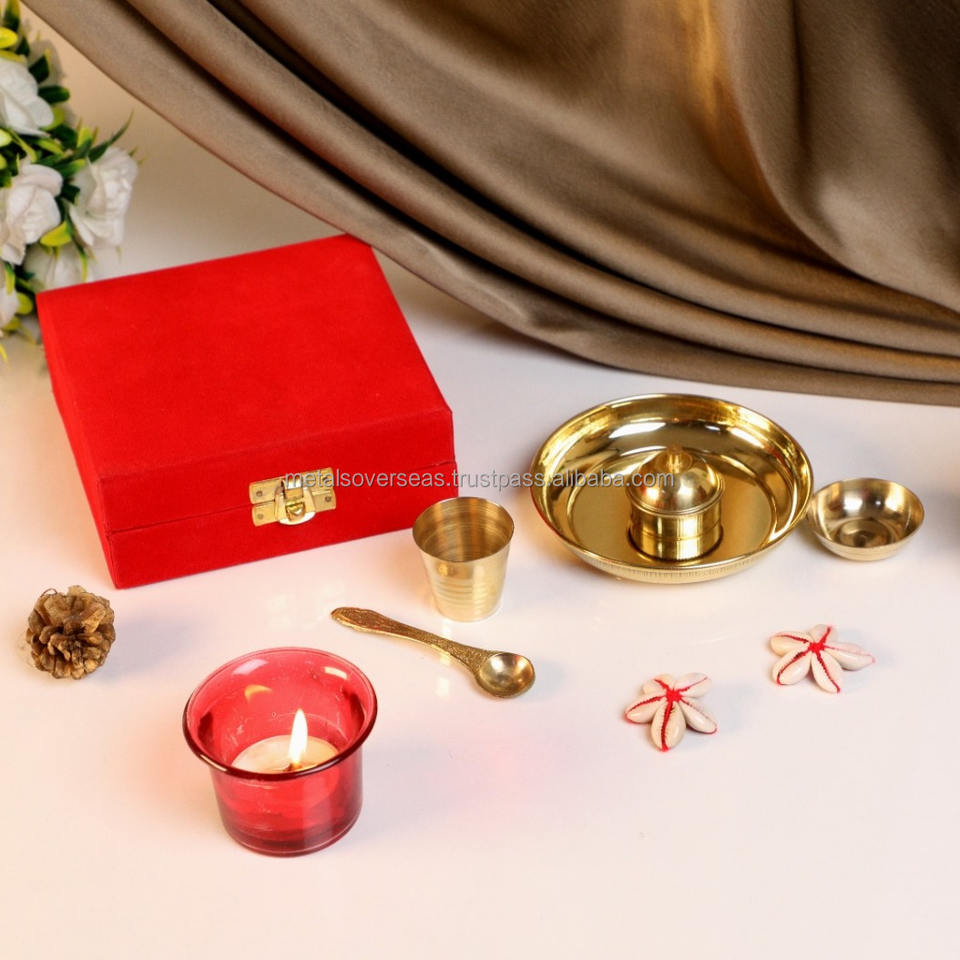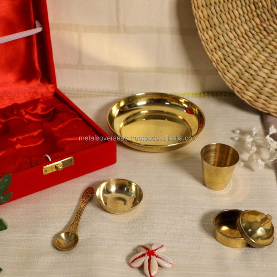 ชุดถาดบูชาทองเหลืองชุบบริสุทธิ์ ขนาดเล็ก | 4 นิ้ว (ชุดอุปกรณ์พิธีกรรม 5 ชิ้น) (พร้อมกล่องของขวัญ) ของตกแต่งบ้านสำนักงานสำหรับเทศกาลดีวาลี