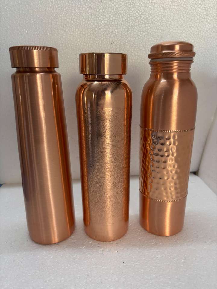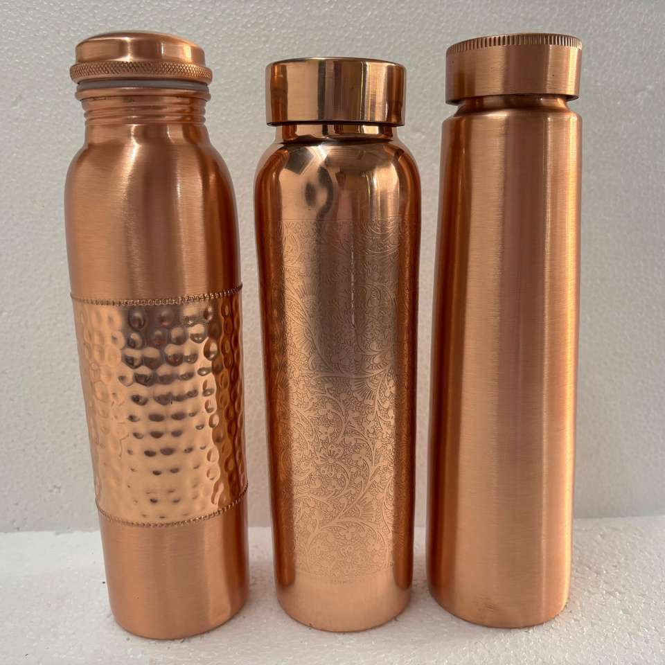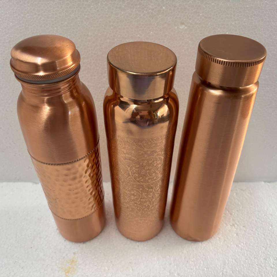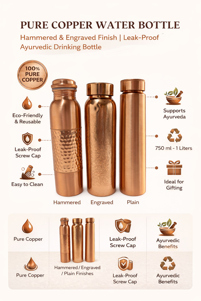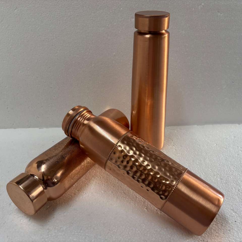 ขวดน้ำทองแดงแท้สองชั้นพร้อมหลอดและฝาปิด | ขวดน้ำอายุรเวชแบบกันรั่ว ผิวผิวสัมผัสแบบตอกและสลัก
