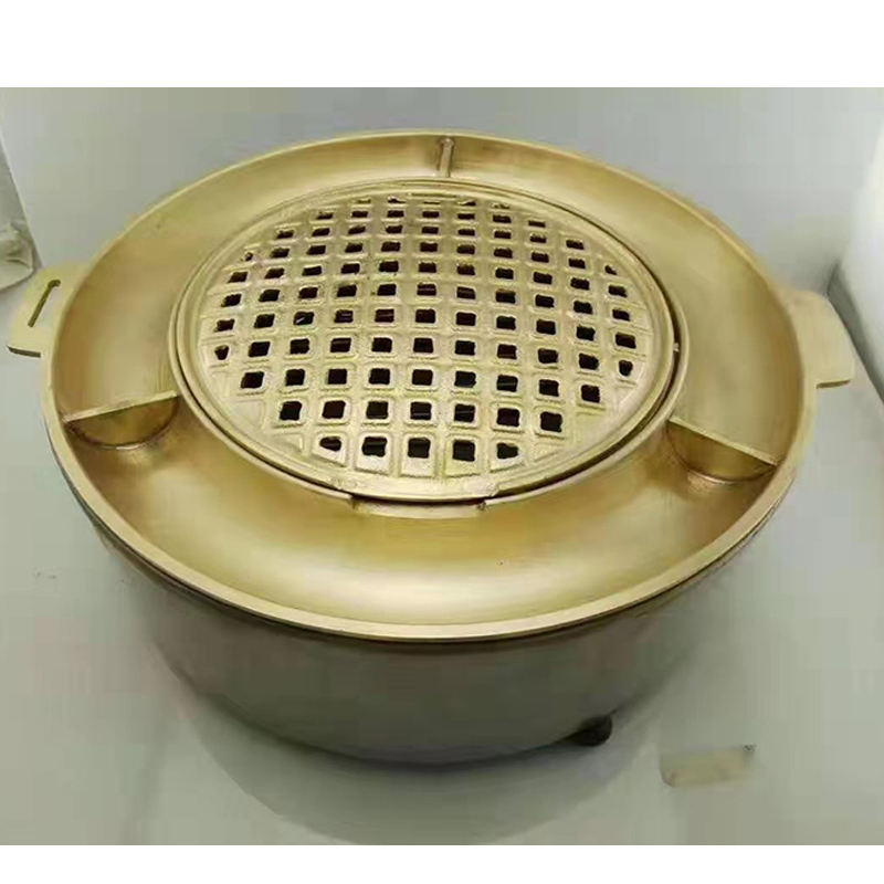 หมูและเนื้อวัวย่างทองบนตะแกรงทองแดงบริสุทธิ์ ทอดในน้ำในกระทะทองแดงบริสุทธิ์