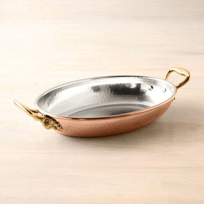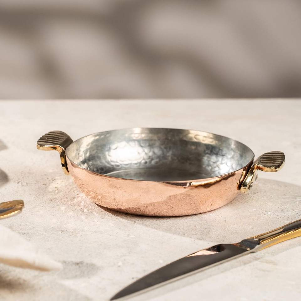 กระทะทองแดงแท้พร้อมด้ามจับทองเหลืองขัดเงา กระทะทำอาหารแบบตอกลาย สำหรับทอด ผัด และจัดเสิร์ฟอย่างมีสไตล์