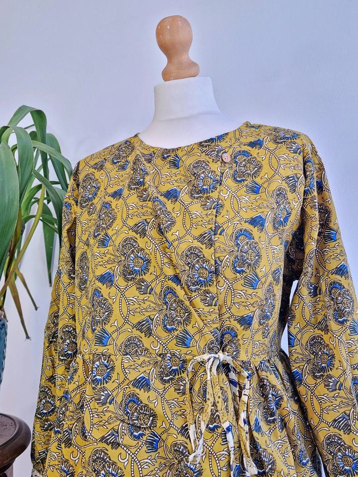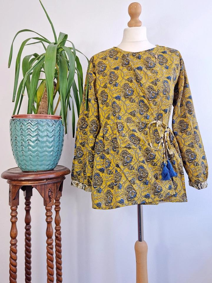 เสื้อเบลาส์โบฮีเมียนผ้าฝ้ายแท้สีม้อมมัสตาร์ดสีฟ้าสไตล์อินเดียชุดใส่ประจำวันแสนสบายสำหรับฤดูร้อน