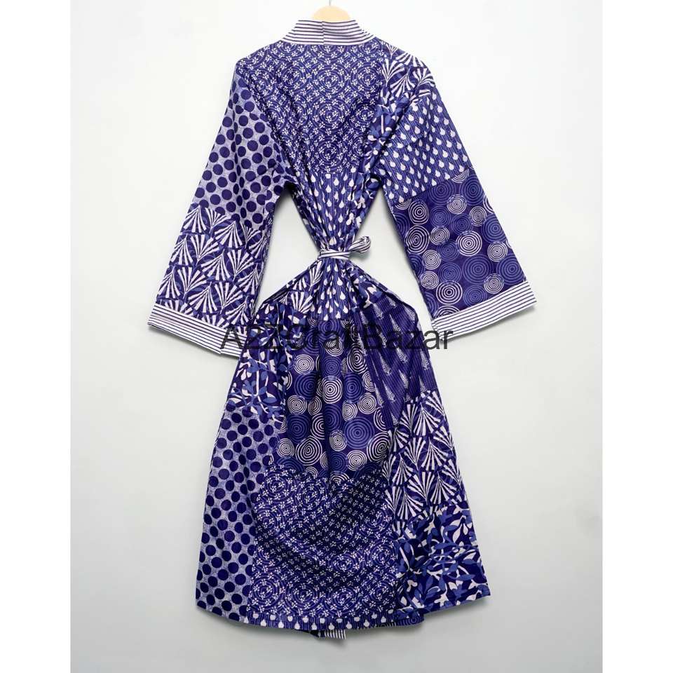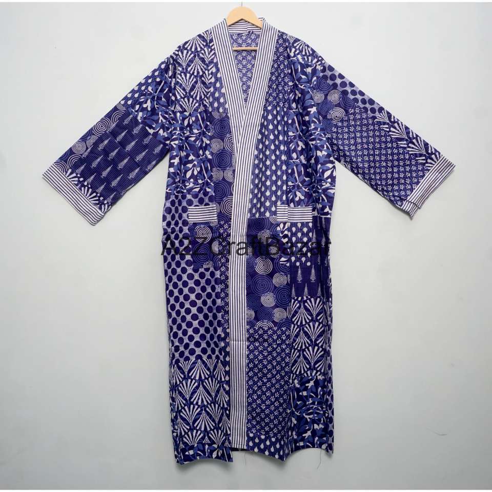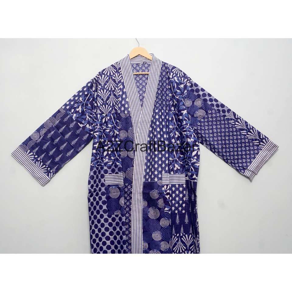 ชุดคลุมกิโมโนยาวคอวีลายทางพิมพ์บล็อกผ้าฝ้ายแท้ เป็นมิตรกับสิ่งแวดล้อม ซักได้ เหมาะสำหรับใส่คลุมชุดว่ายน้ำชายหาดในฤดูร้อน สไตล์โบฮีเมียน เนื้อผ้านุ่ม