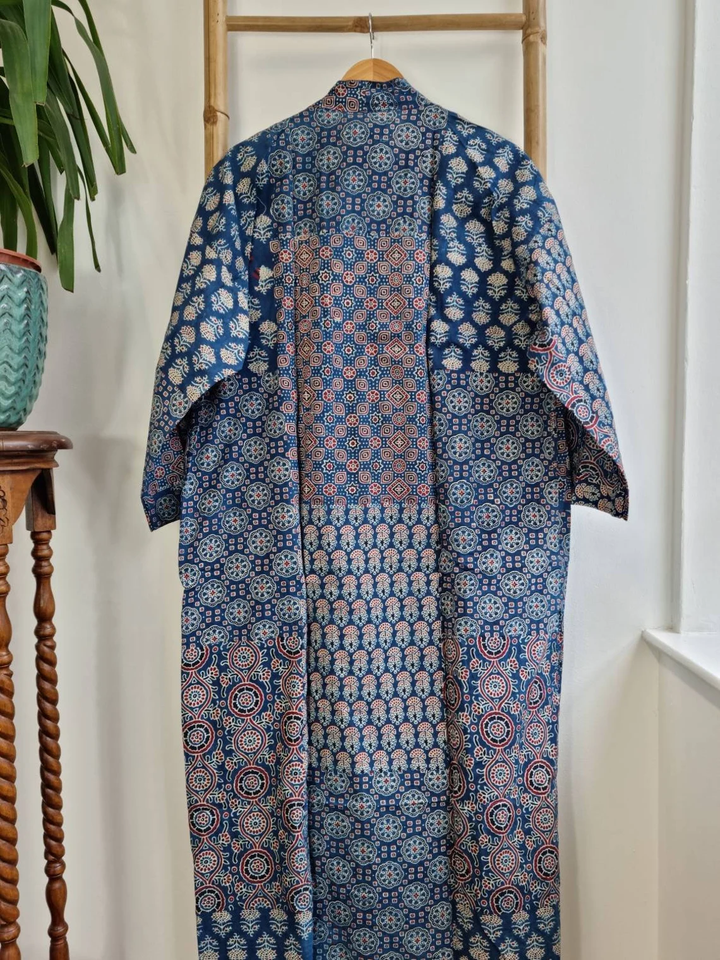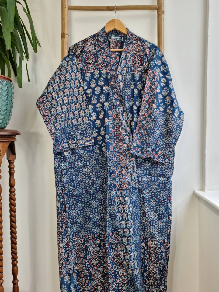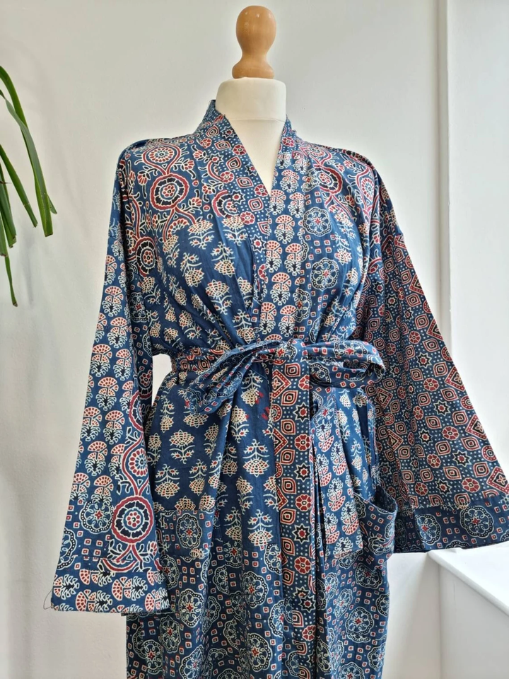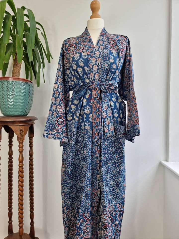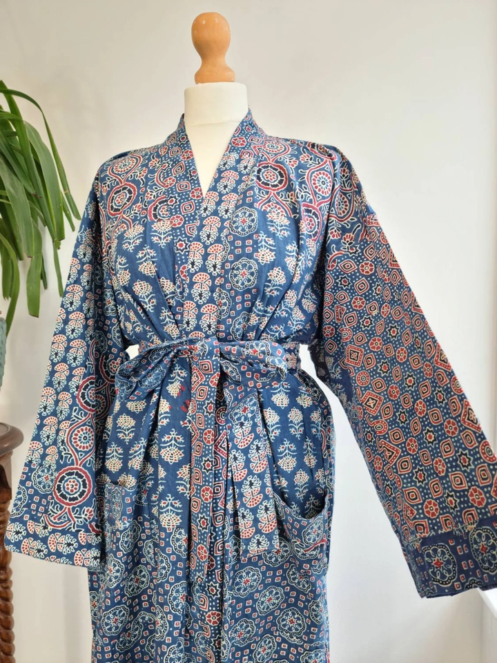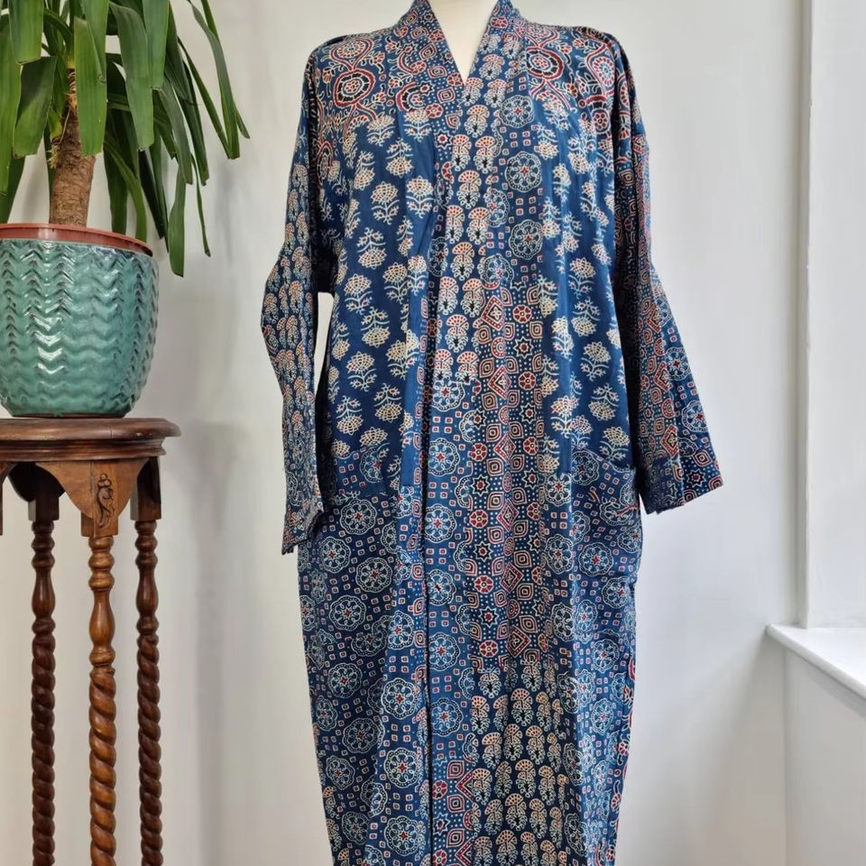 ชุดเดรสผ้าฝ้ายบริสุทธิ์พิมพ์ลายแบบอินเดียใส่สบายชุดกิโมโนสีฟ้าครามคลุมเชือกผูกสำหรับคุณแม่