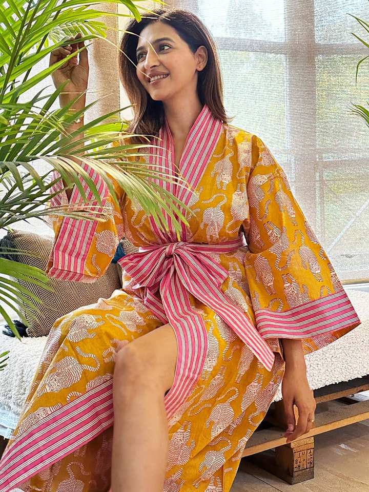 Pure Cotton Indian Block Printed House Robe Summer Kimono Beach Coverup Comfy Maternity Fresh Yellow Mustard Pink