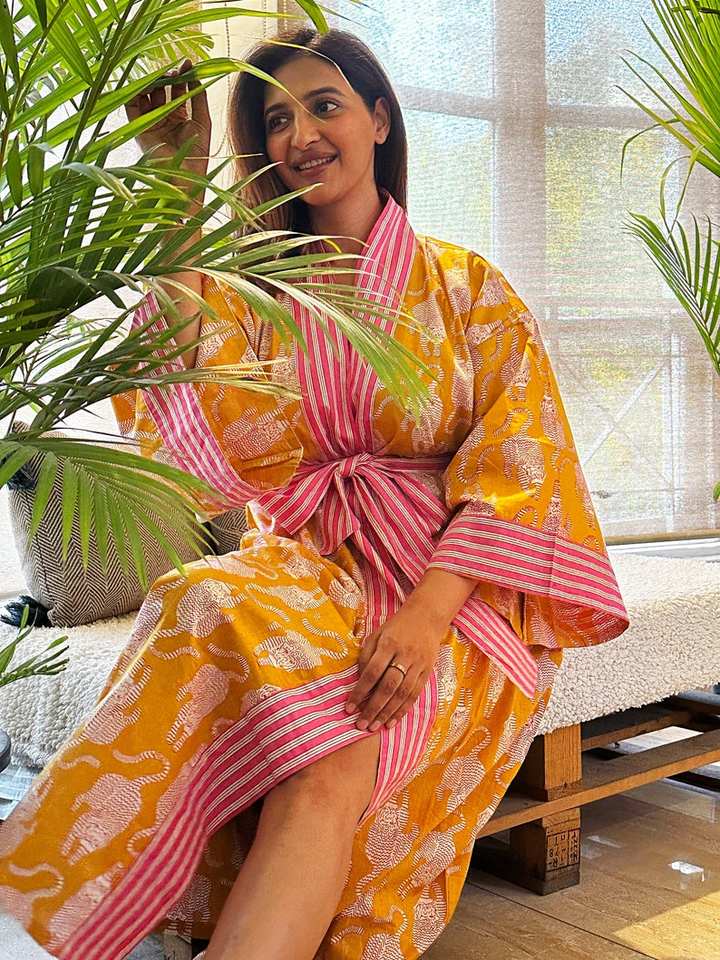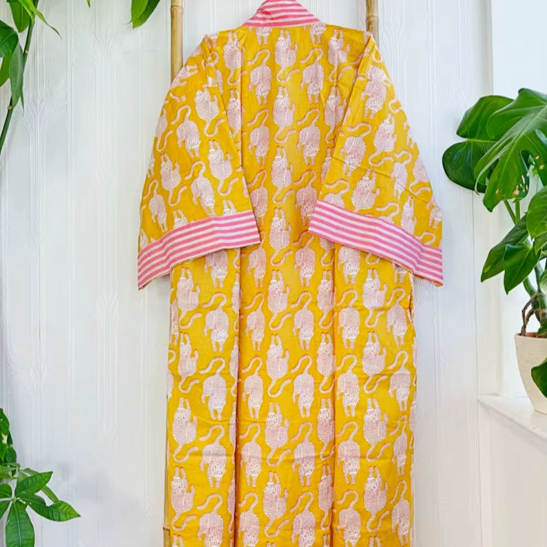 เสื้อคลุมพิมพ์ลายสไตล์อินเดียสำหรับบ้านชุดคลุมชายหาดชุดกิโมโนสำหรับคุณแม่สวมใส่สบายสีเหลืองสดสีชมพูมัสตาร์ด