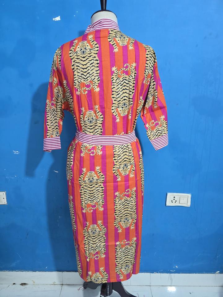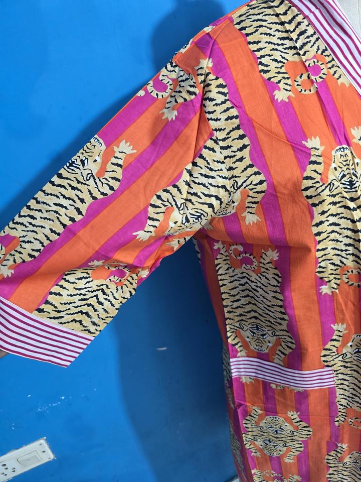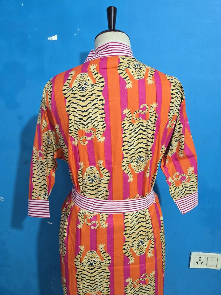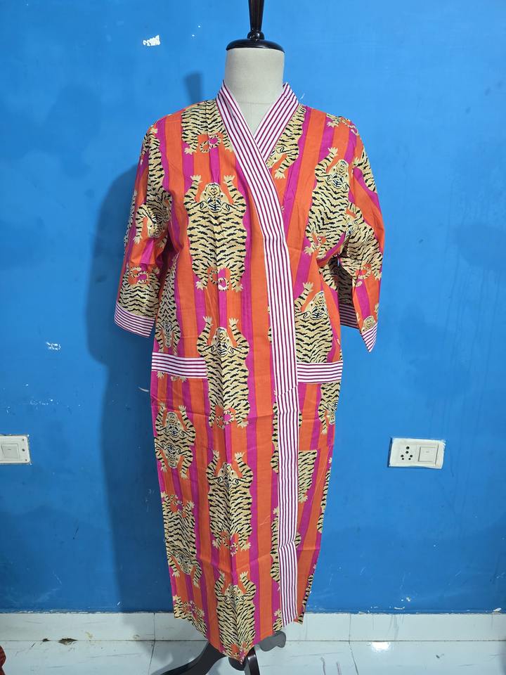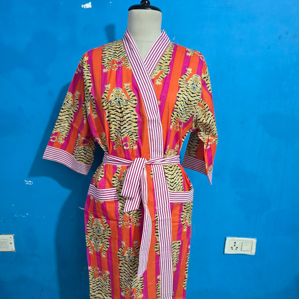 ชุดคลุมอาบน้ำผ้าฝ้ายแท้พิมพ์ลายบล็อกอินเดีย ชุดกิโมโนฤดูร้อนลายเสือ ชุดคลุมชายหาด/ชุดคลุมกิโมโนสำหรับคนท้องใส่สบาย ชุดคลุมอาบน้ำสำหรับฤดูใบไม้ผลิ ของขวัญ