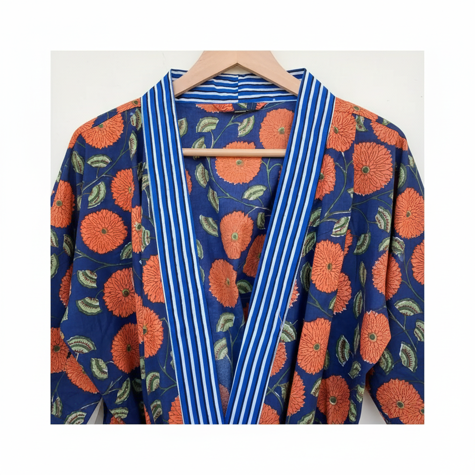 เสื้อคลุมกิโมโนผ้าฝ้ายพิมพ์ลายบล็อก