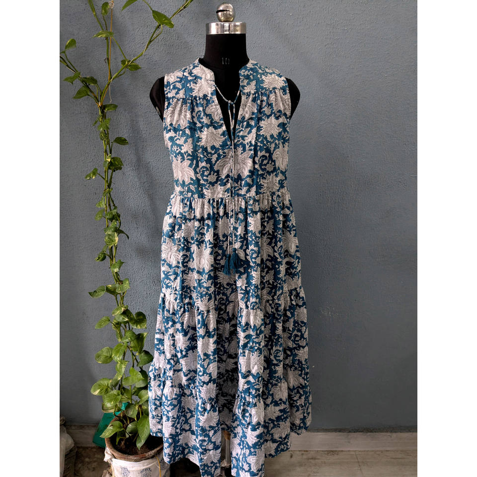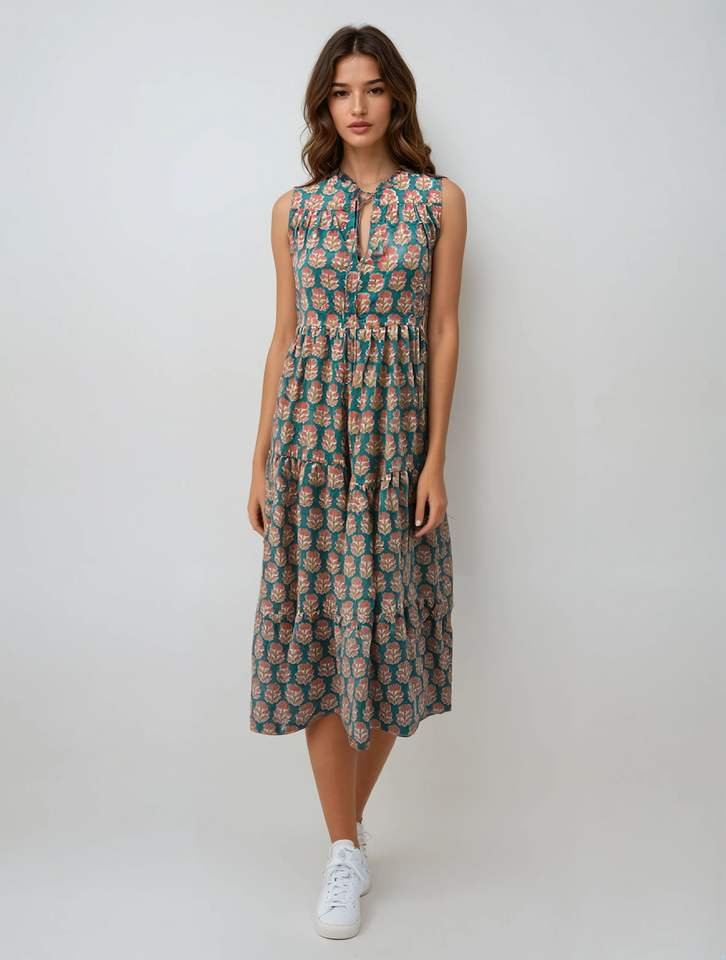 เดรสผ้าฝ้ายแท้สำหรับฤดูร้อนเดรสอินเดียเดรสพิมพ์ลายดอกไม้แขนกุดสไตล์โบฮีเมียนแขนกุด
