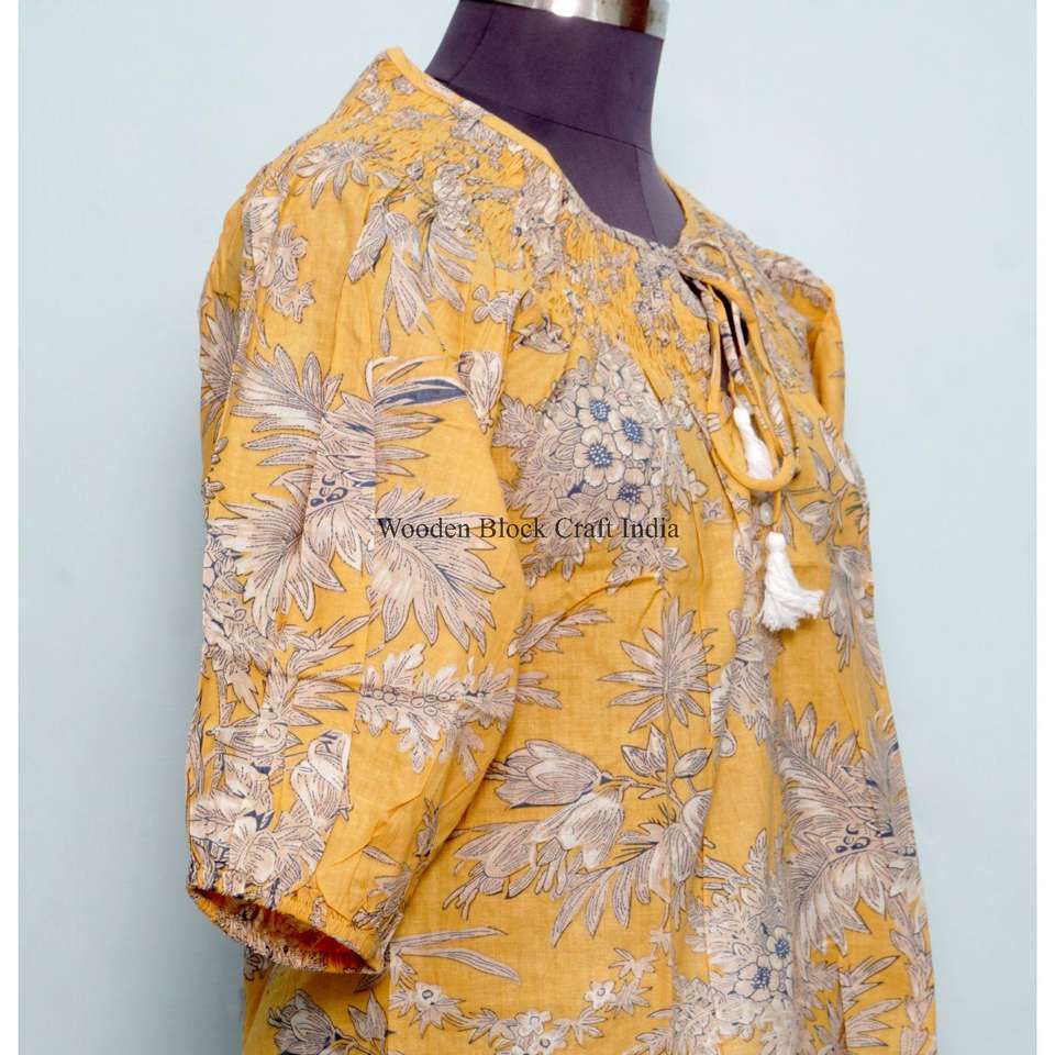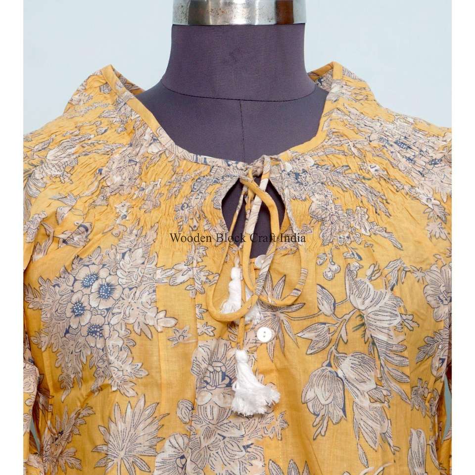 ชุดเดรสลำลองผ้าฝ้ายแท้สำหรับผู้หญิง ลายดอกไม้ แขนพอง แต่งพู่ ด้านหน้ามีเชือกผูก