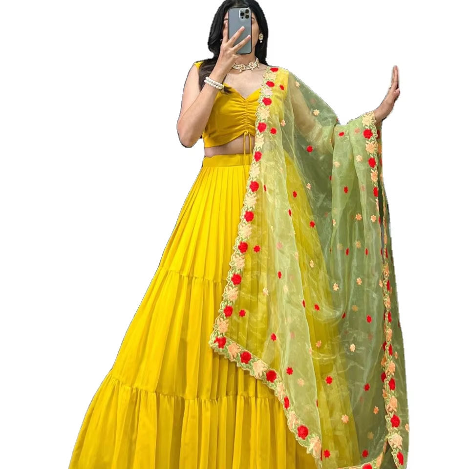 ชุด lahenga choli สำหรับคืนกลางคืนชุดราตรีชุดราตรี lahenga เจิดจ้าสีเหลืองสดใส