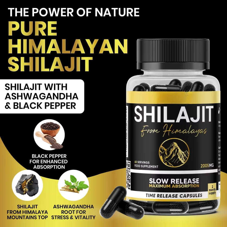 สารสกัดชิลลาจิตบริสุทธิ์จากเทือกเขาหิมาลัย 50:1 แบบแคปซูลสำหรับผู้ชายและผู้หญิง แคปซูลชิลลาจิตดิบ 500 มก./60 แคปซูล เพื่อเสริมสร้างความแข็งแรงและพลังงาน