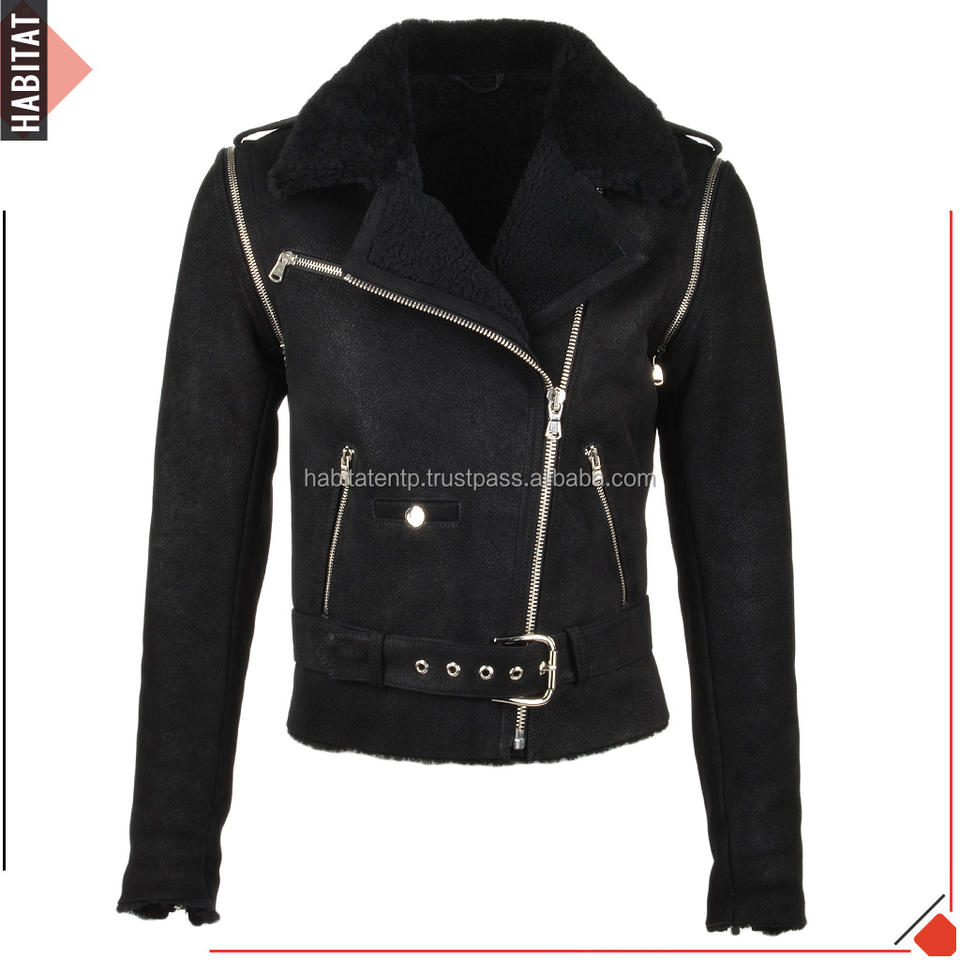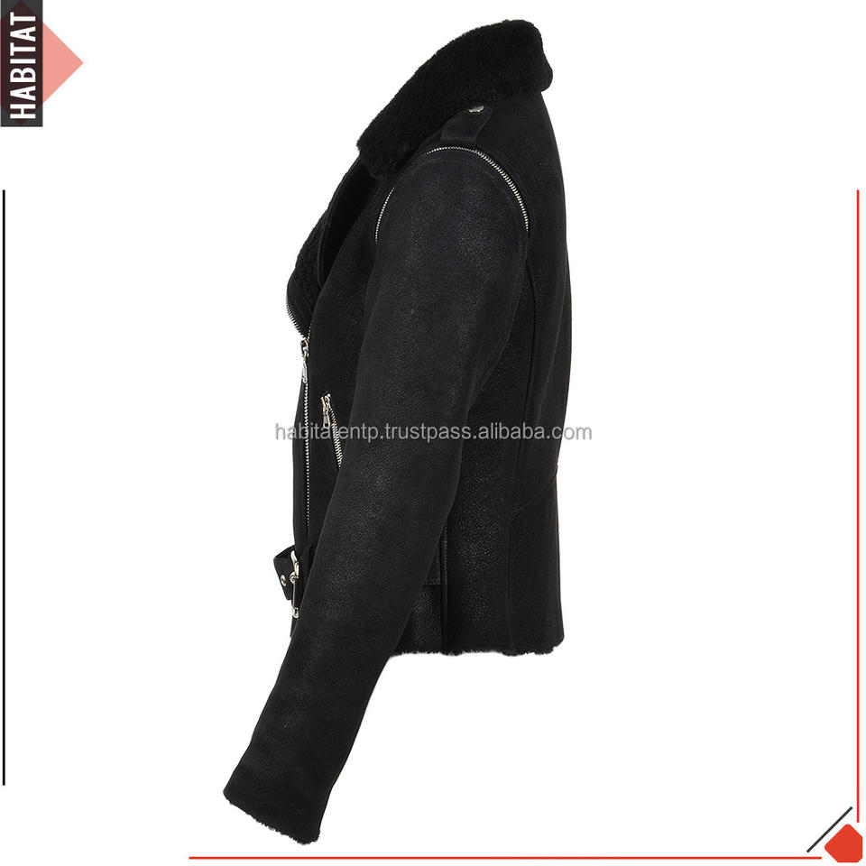 เจ็ทบริสุทธิ์สีดําผู้หญิงแจ็คเก็ตหนัง Maat หนังแกะขนซับภายในปกขนเสื้อแจ็คเก็ตนักขี่จักรยานสภาพอากาศที่อบอุ่น