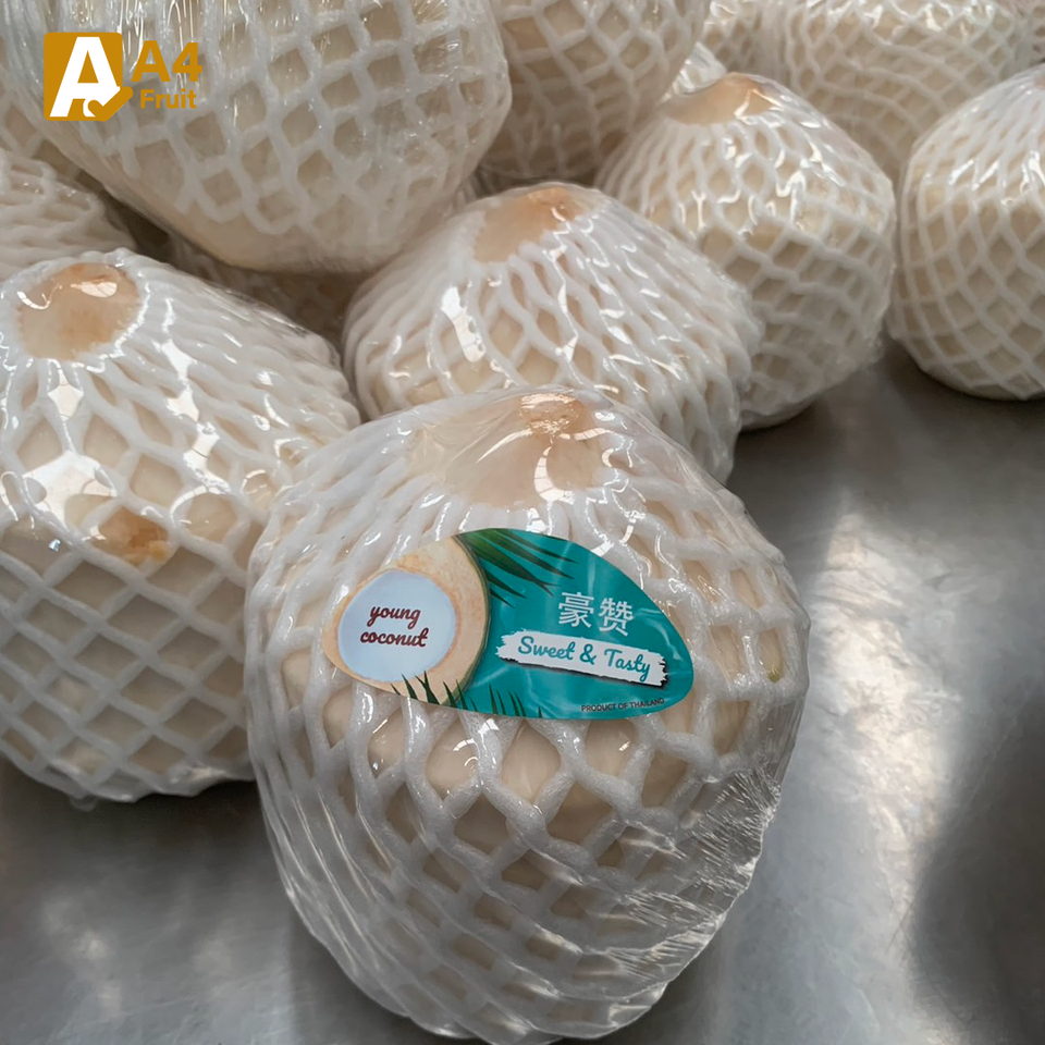 มะพร้าวกึ่งแกลบสดสำหรับดื่มโดยมีผลไม้และส่วนเปลือก