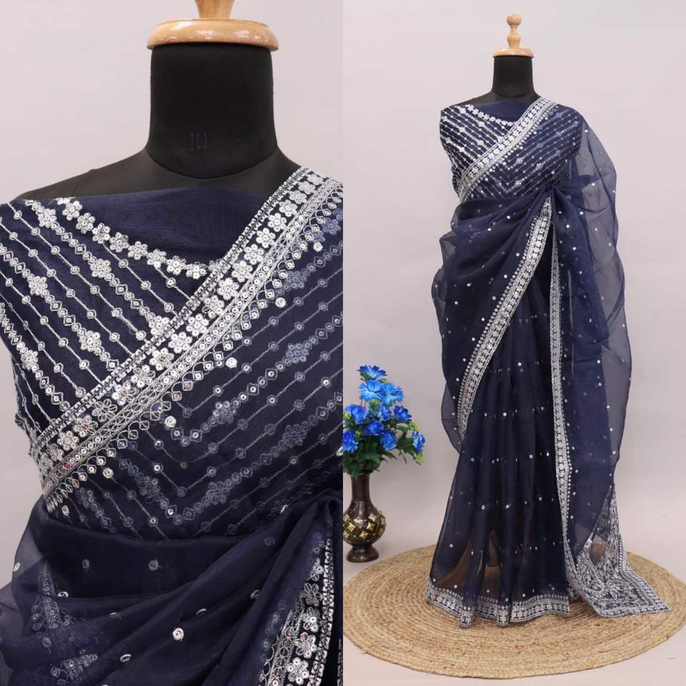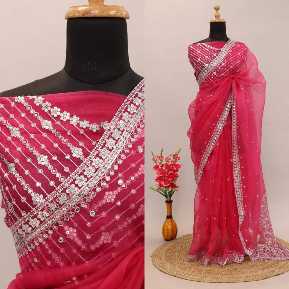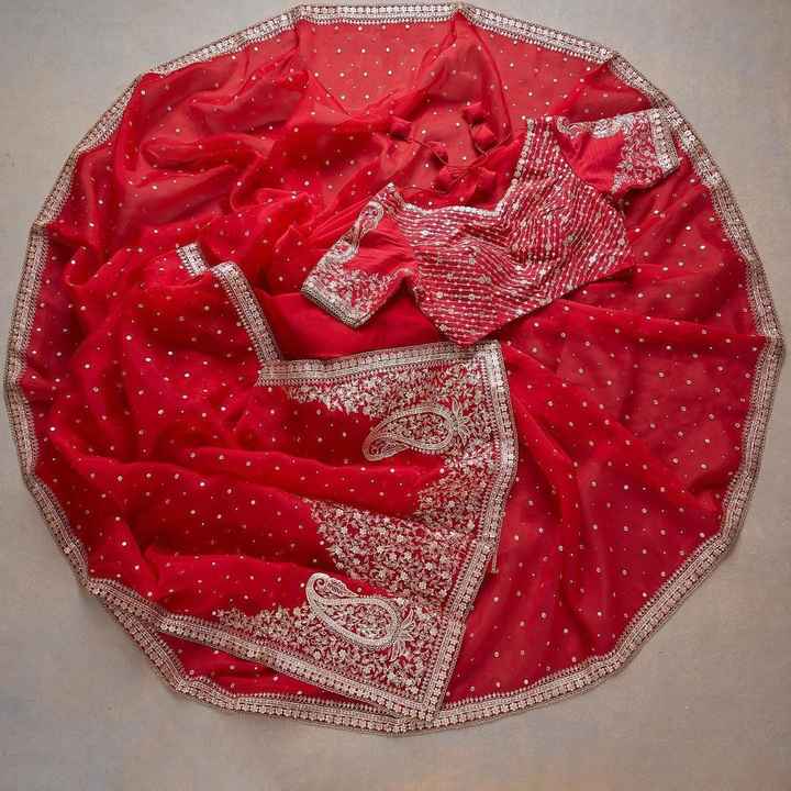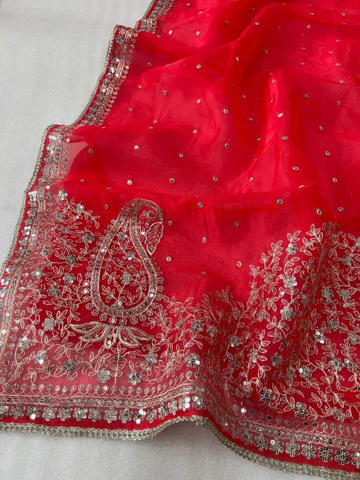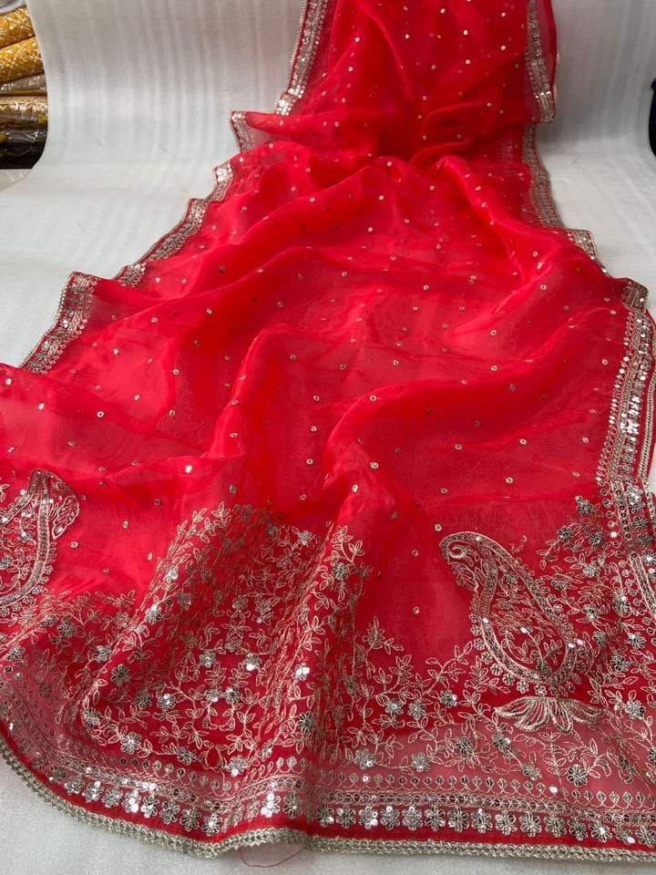ผ้าไหมออร์แกนซ่าแท้สีแดง พร้อมงานปักดิ้นเงินบนผ้าส่าหรี พร้อมเสื้อคลุมผ้าออร์แกนซ่า