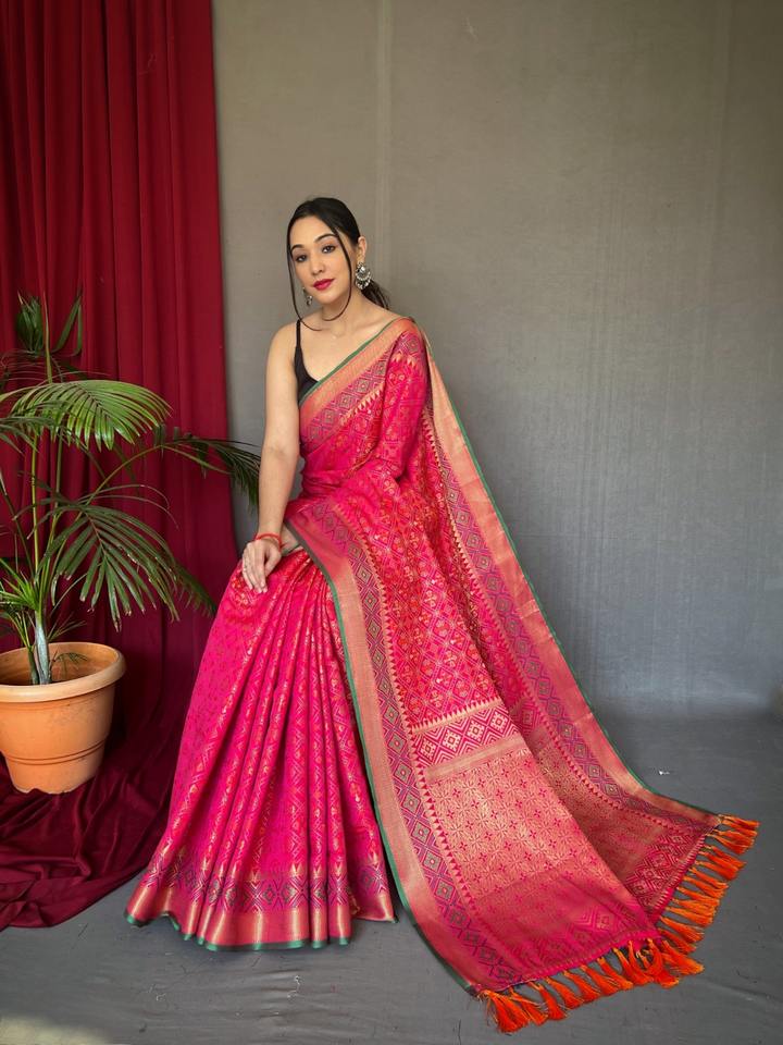 ผ้าไหมปาตอล่าแท้จาก Fabzone สำหรับผู้หญิง ลายมีนาการี ตัดกันอย่างมีสไตล์ พร้อมพู่ห้อย รุ่น CATLAOG RAJKOTI PATOLA เหมาะสำหรับงานปาร์ตี้