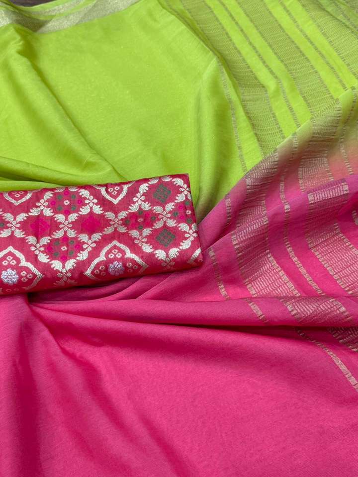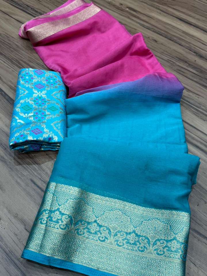 ผ้าไหมชีฟองเนื้อละเอียดประกายเงางาม พร้อมผ้าปัลลูทอลายชิต ย้อมสีด้วยมือแบบไจปุร์ ขอบผ้าปักดิ้นทองหรูหรา พร้อมสำหรับงานปาร์ตี้
