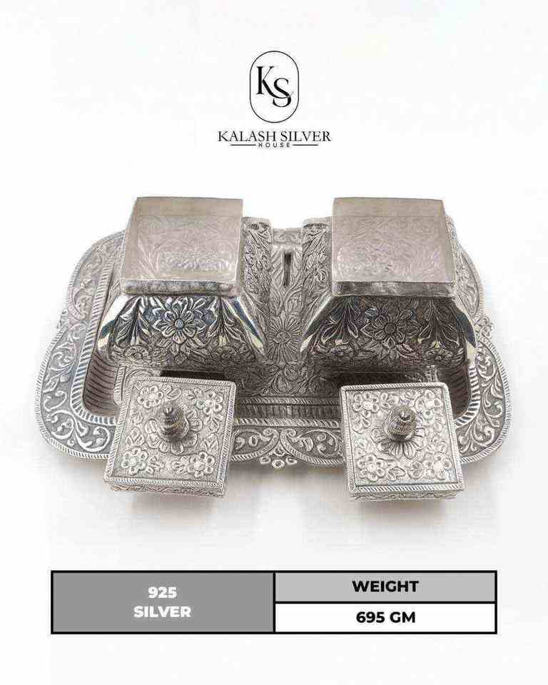 ชุดกล่องคุมคุมและฮัลเดิลเงินแท้ พร้อมถาด ลวดลายดอกไม้แบบดั้งเดิม งานฝีมือสำหรับพิธีกรรมในบ้านหรือวัด เหมาะสำหรับเป็นของขวัญ