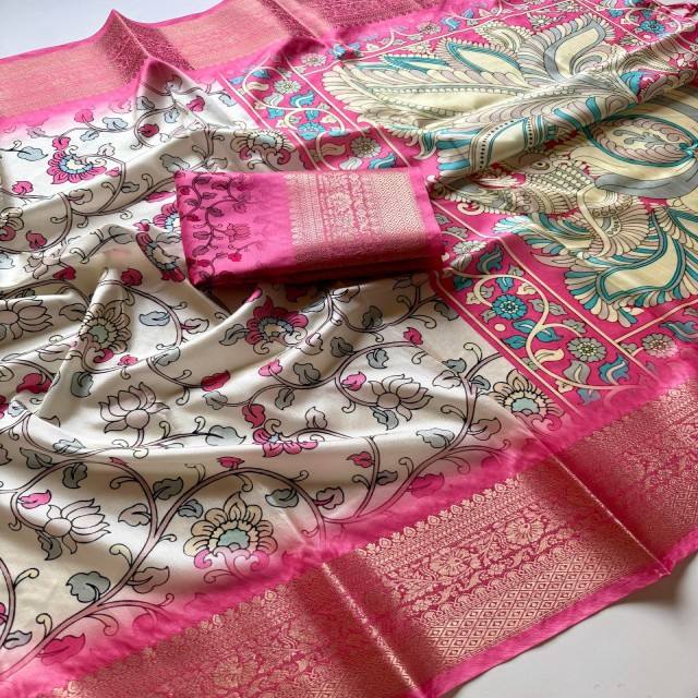 ผ้าไหมลิ้นจี่เนื้อนุ่มพิเศษ พร้อมลายพิชไวแบบดิจิทัล คัลลัมคารี ขอบผ้าแจ็คการ์ดหรูหรา ลายพิมพ์ทั้งสองด้านเหมือนกัน ดีไซน์พรีเมียมสำหรับผ้าส่าหรี