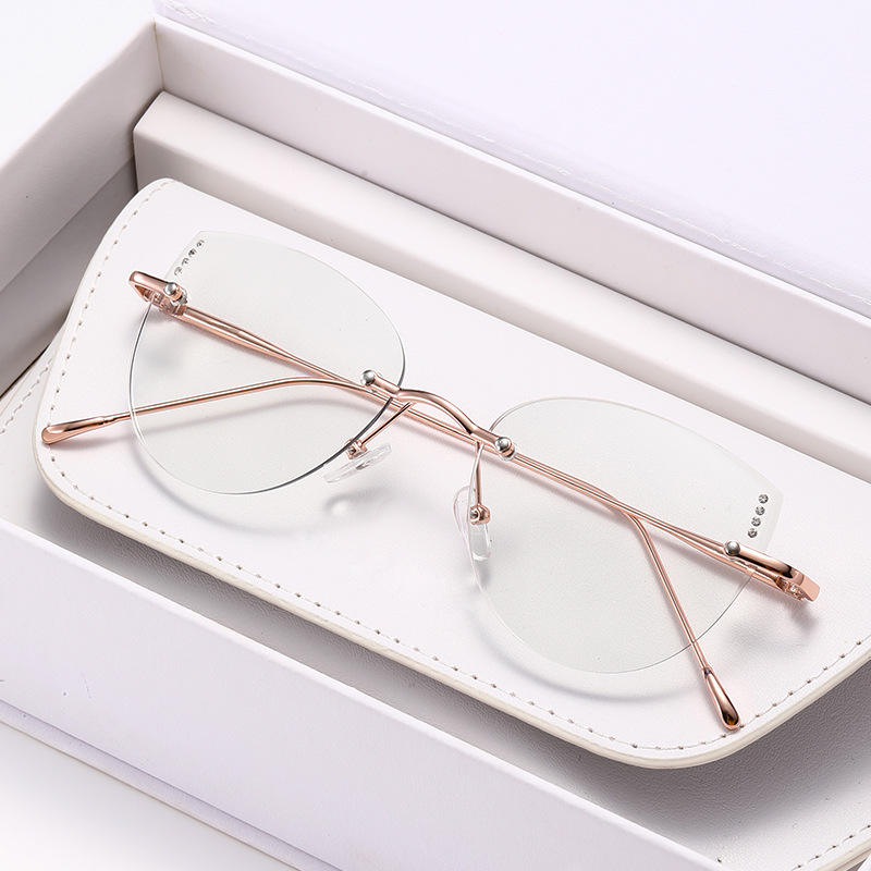 แว่นตาไทเทเนียมบริสุทธิ์ไร้กรอบกรอบรูปไข่แว่นสายตาผู้หญิงเปลี่ยนสีได้ป้องกันแสงสีฟ้าเลนส์พีซีขนาดกลาง
