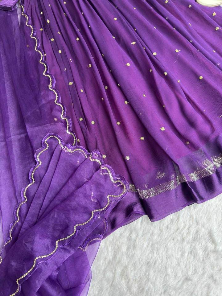 ชุดเดรส Anarkali ผ้าจอร์เจตเนื้อหนาคุณภาพดี แขน 3/4 ลายพิมพ์ สีม่วง ไซส์ S ถึง XXL พร้อมผ้าคลุมไหล่ ขาย