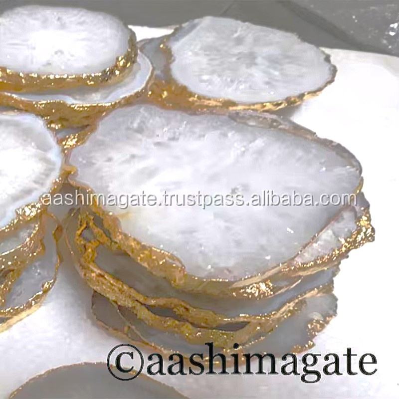 จานรองแก้วหินโมราสีขาวบริสุทธิ์พร้อมขอบทองวัสดุพลอยสไตล์ฮวงจุ้ย