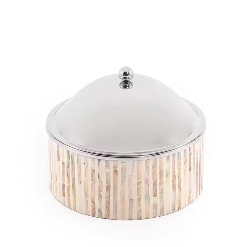 หม้อต้มทำจากไม้แท้และแม่ของไข่มุกหม้อไฟทรงกลมพร้อมฝาโลหะ