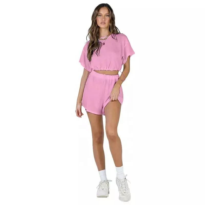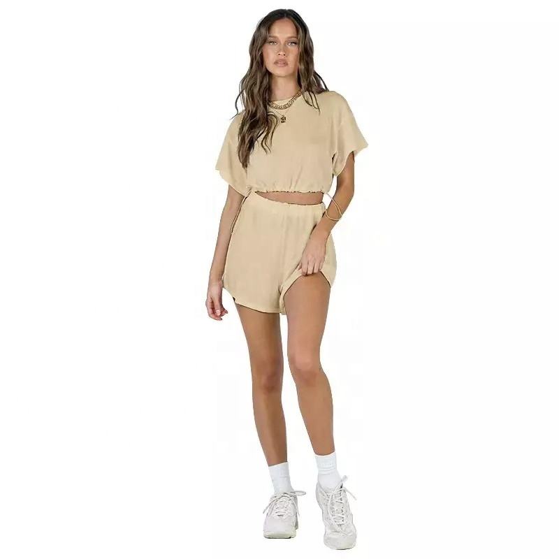 ชุดบ้าน2ชิ้นของผู้หญิง,กางเกงขาสั้นลำลองแขนสั้นคอกลมผูกเชือกสีพื้นแฟชั่นฤดูร้อน