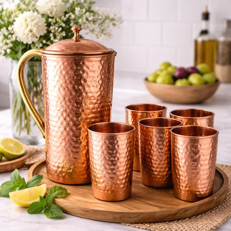 เหยือกทองแดงทำมือสำหรับเก็บน้ำดื่ม ใช้ในครัวเรือนแบบอินเดียดั้งเดิม ใช้ได้ทุกวัน