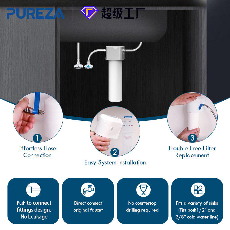 เครื่องกรองน้ำ Pureza รุ่น S003 ระบบติดตั้งใต้ซิงค์ แรงดันน้ำ 400 PSI ผ่านการทดสอบแรงดัน อะไหล่เปลี่ยนก๊อกน้ำในครัว