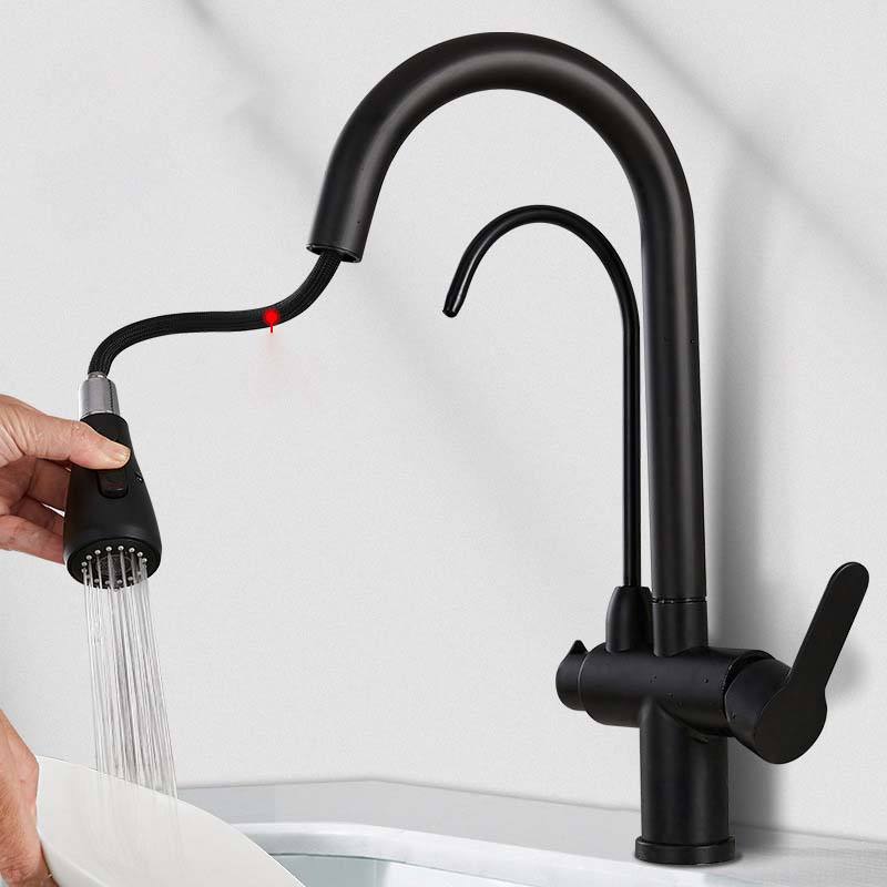 ก๊อกน้ำกรองน้ำสำหรับห้องครัว สีดำ 360 ° ก๊อกน้ำกรองแบบหมุนได้ หัวฉีดแบบดึงออกได้ 3 ทาง ก๊อกผสมน้ำร้อนน้ำเย็น