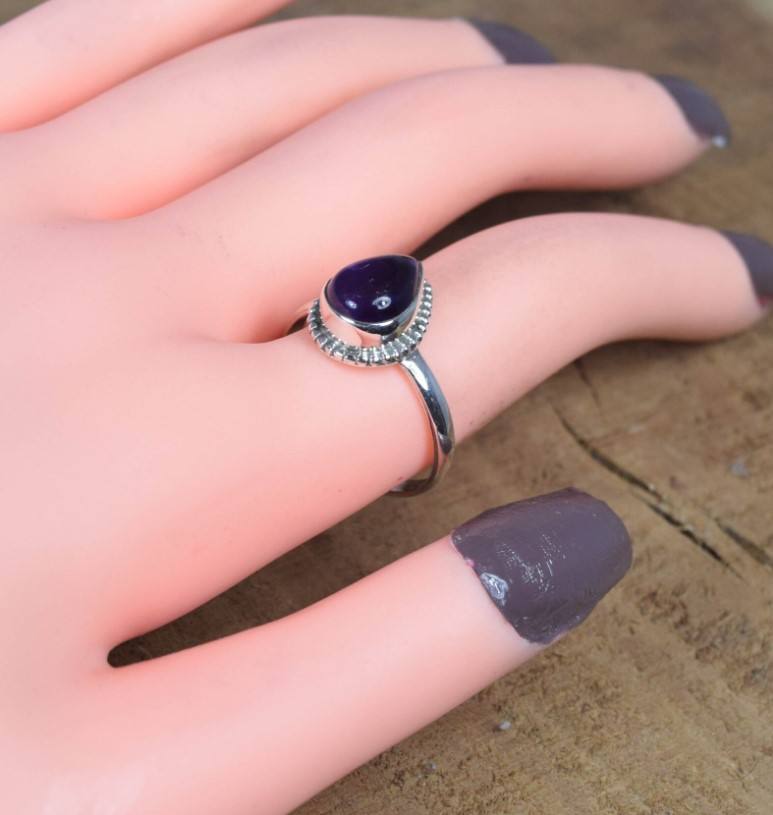 แหวนเงินแท้ 925 ประดับพลอยอเมทิสต์สีม่วงแท้คุณภาพสูงสุด รูปทรง Peace ขนาด 7x9 มม. ฝังแบบ Bezel Setting ทำด้วยมือ เหมาะสำหรับงานปาร์ตี้และงานแต่งงาน
