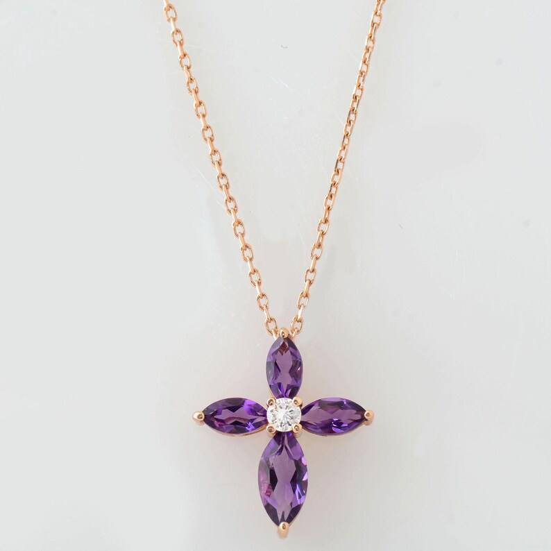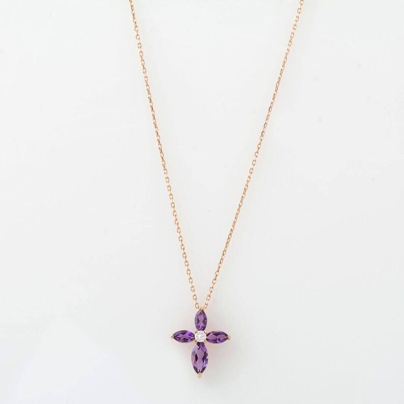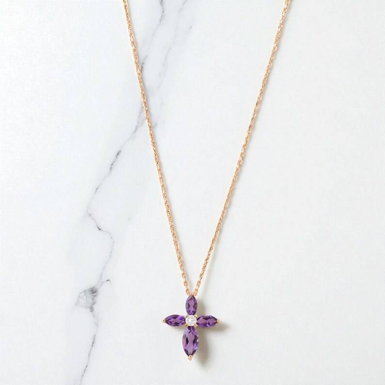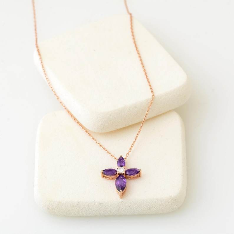 สร้อยคอพลอยอเมทิสต์สีม่วงทรงลูกแพร์ พร้อมจี้กางเขนพลอยอเมทิสต์แท้ รับรองคุณภาพ เงินแท้ 925 ชุบทอง 14K