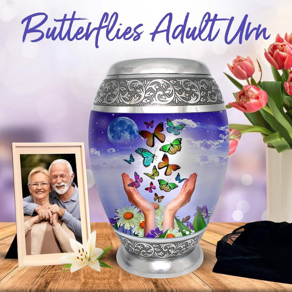 โกศผีเสื้อสีม่วงสําหรับเถ้ามนุษย์ผู้ใหญ่หญิงและชาย - โกศเผาศพขนาดใหญ่สําหรับเถ้าผู้ใหญ่ผู้หญิงและผู้ชายที่มีกระเป๋า - เกียรติยศ