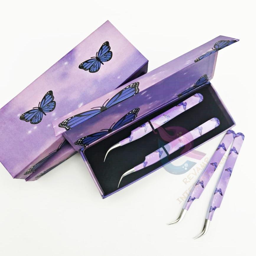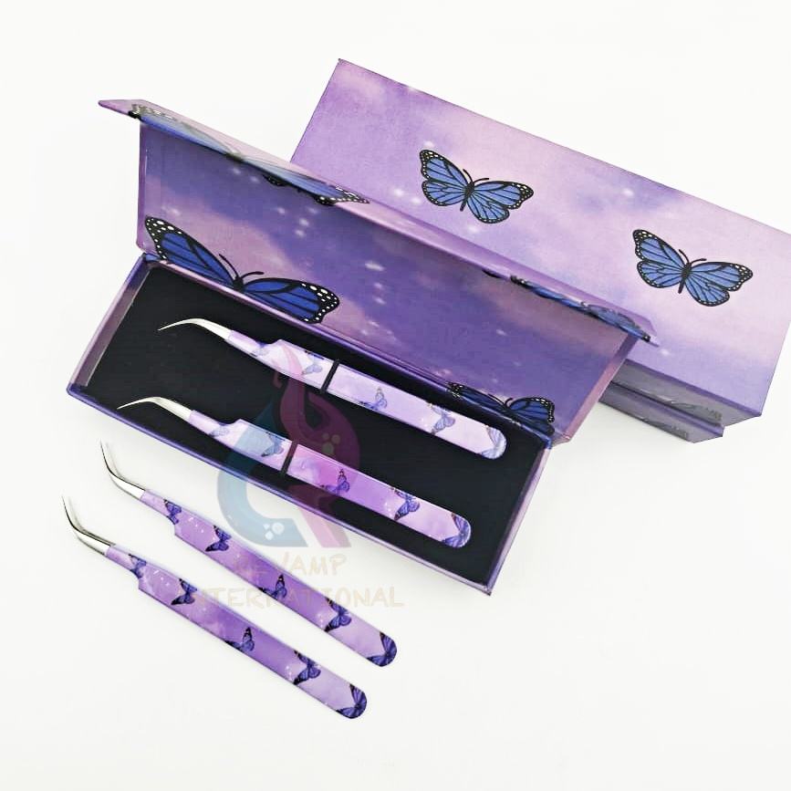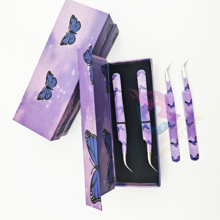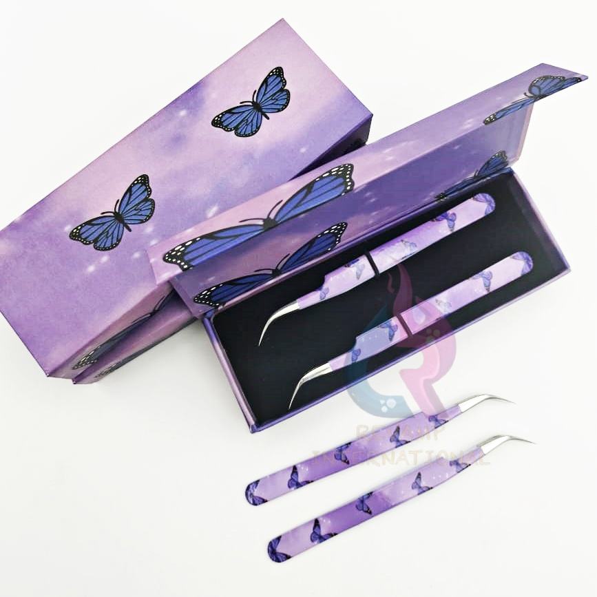 แหนบต่อขนตาพิมพ์รูปผีเสื้อสีม่วงทำจากสเตนเลสปลายโค้งแบบแยกกล่องออกแบบได้ตามต้องการ